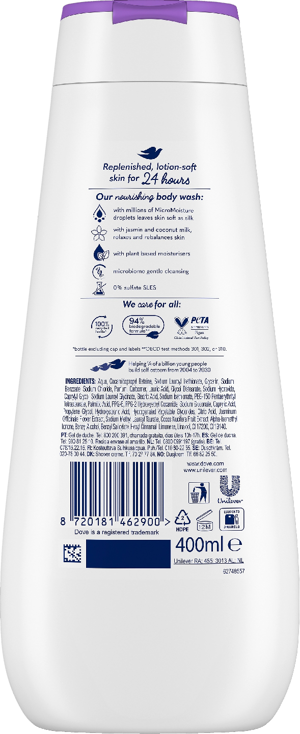 Dove Advanced Care Relaxing -suihkusaippua tekee päivittäisestä suihkuhetkestä rentouttavan kokemuksen. Jasmiinia ja kookosmaitoa sisältävä kosteuttava suihkusaippua puhdistaa hellävaraisesti ja rauhoittaa kuivaa ihoa. Se jättää iholle pehmeän ja sileän tunteen jo yhden pesukerran jälkeen. Toisin kuin tavalliset suihkusaippuat, Dove Advanced Care sisältää 24h Renewing MicroMoisture -pisaroita. Kyseessä on Doven uraauurtava uusi teknologia. Siinä miljoonat pienet, tehokkaasti kosteuttavat pisarat eivät peseydy iholta pois, vaan imeytyvät syvälle ihoon. Ne tukevat ihon luonnollista uudistumisprosessia ja auttavat ihoa säilyttämään kosteuden myös suihkun jälkeen. Ota hetki aikaa itsellesi ja hemmottele ihoasi ja aistejasi. Dove Advanced Care Relaxing -suihkusaippuan ansiosta jokainen suihku on rentouttava nautinto. Jasmiinia ja kookosmaitoa sisältävä suihkusaippua tuoksuu ihanan kukkaiselta. Runsaan täyteläinen vaahto tuntuu miellyttävältä, rentouttaa ja kosteuttaa ihoa kuin kosteusvoide. Lopputuloksena on ihastuttavan raikas iho, joka tuntuu pehmeältä kuin silkki. Dermatologisesti testattu suihkusaippua puhdistaa ja kosteuttaa ihoa luonnollisesti. Sen sulfaatiton koostumus sisältää luonnollisia mietoja puhdistusaineita ja ihoa ravitsevia ainesosia. Se ei sisällä SLES-sulfaatteja, vaan se on hellävarainen mikrobiomille – ihon elävälle suojakerrokselle. Doven visiona on maailma, jossa kauneus herättää itseluottamusta eikä ahdistusta. Siksi Dove on ottanut tehtäväkseen auttaa seuraavaa sukupolvea luomaan myönteisen suhteen omaan ulkonäköönsä. Lisäksi Dove on sitoutunut vähentämään muovijätettä ja se pyrkiikin osaltaan puuttumaan maailmanlaajuiseen kauneudenhoitoalan muovijäteongelmaan. Dove Advanced Care Relaxing -suihkusaippuan koostumus on 94-prosenttisesti biohajoava*. Pullo on kokonaan kierrätettävä ja valmistettu täysin kierrätysmuovista**. Lisäksi Doven tuotteita ei testata koskaan eläimillä missään päin maailmaa. Yritys on saanut PETA Vegan Cruelty Free -sertifioinnin. *OECD-testimenetelmät 301, 302 tai 310 **korkki ja etiketti pois lukien