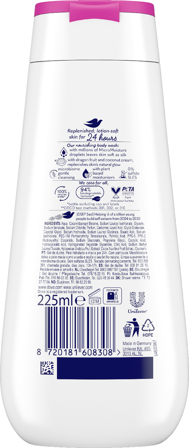 Dove Advanced Care Replenishing -suihkusaippua virkistää aisteja ja kosteuttaa ihoa. Suihkusaippuan sisältämä pistaasi ja kookoskerma auttavat palauttamaan ihon luonnollisen hehkun jo yhden suihkukerran jälkeen. Herätä ihosi hemmottelevalla suihkulla, jonka jälkeen ihosi on ihanasti kosteutettu ja pehmeä. Toisin kuin tavalliset suihkusaippuat, Dove Advanced Care sisältää 24h Renewing MicroMoisture -pisaroita. Kyseessä on Doven uraauurtava uusi teknologia. Siinä miljoonat pienet, tehokkaasti kosteuttavat pisarat eivät peseydy iholta pois, vaan imeytyvät syvälle ihoon. Ne tukevat ihon luonnollista uudistumisprosessia ja auttavat ihoa säilyttämään kosteuden myös suihkun jälkeen. Dove Advanced Care Replenishing -suihkusaippua ei vain elvytä ihoa – se piristää ja virkistää aistejasi. Kevyesti vaahtoava ja syvästi kosteuttava suihkusaippua puhdistaa hellävaraisesti. Se jättää iholle raikkaan pistaasin ja kookoskerman tuoksun ja tekee ihosta kosteutetun ja voidemaisen pehmeän. Suihkun jälkeen ihosi on raikas, sileä, ihanasti kosteutettu ja pehmeä kuin silkki. Dermatologisesti testattu suihkusaippua puhdistaa ja kosteuttaa ihoa luonnollisesti. Sen sulfaatiton koostumus sisältää luonnollisia mietoja puhdistusaineita ja ihoa ravitsevia ainesosia. Sulfate free -suihkusaippua ei sisällä SLES-sulfaatteja, vaan se on hellävarainen mikrobiomille – ihon elävälle suojakerrokselle. Doven visiona on maailma, jossa kauneus herättää itseluottamusta eikä ahdistusta. Siksi Dove on ottanut tehtäväkseen auttaa seuraavaa sukupolvea luomaan myönteisen suhteen omaan ulkonäköönsä. Lisäksi Dove on sitoutunut vähentämään muovijätettä ja se pyrkii osaltaan puuttumaan maailmanlaajuiseen kauneudenhoitoalan muovijäteongelmaan. Dove Advanced Care Replenishing -suihkusaippuan koostumus on 94-prosenttisesti biohajoava*. Pullo on kokonaan kierrätettävä ja valmistettu täysin kierrätysmuovista**. Lisäksi Doven tuotteita ei testata koskaan eläimillä missään päin maailmaa. Yritys on saanut PETA Vegan Cruelty Free -sertifioinnin. **94 % ainesosista hajoaa hiilidioksidiksi, vedeksi ja mineraaleiksi (OECD-testimenetelmät 301, 302 tai 310) **korkki ja etiketti pois lukien
