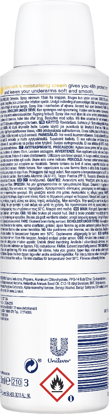 Mietitkö kuinka voisit hoitaa kainaloiden herkkää samalla kun suojaat itsesi hikoilulta ja pahoilta hajuilta? Dove 48h Cucumber antiperspirantti deodorantti spray on tehty juuri sitä varten. Se on luonnon raikkaan kurkun tuoksuinen antiperspiranttisuihke, joka on täysin alkoholiton ja jonka koostkumuksessa on mukana kosteusvoide. Näin se auttaa pitämään ihon pehmeänä ja miellyttävän sileänä kosketukselle. Tämä Doven deodorantti tarjoaa helpotusta kainaloille, koska se auttaa vähentämään kainalokarvojen ajamisen aiheuttamaa ihoärsytystä. Tämä deodoranttisuihke tarjoaa sinulle raikkautta pitkäksi aikaa hajuja torjuvan teknologiansa ansiosta. Doven antiperspirantti deodorantin ansiosta sinä voit tuntea olosi varmaksi myös silloin, kun on aika paljastaa kainalot. Antiperspirantin puhdas tuoksu auttaa sinua aloittamaan päiväsi aina yhtä luottavaisena. Dove 48h Cucumber antiperspirantti deodorantti yhdistää hellävaraisen kainaloiden hoidon pitkäaikaiseen, 48 tunnin hikoilusuojaan. Saat eniten irti 48 tunnin antiperspirantista, kun suihkutat tätä alkoholitonta antiperspiranttideodoranttia tasaisesti kumpaankin kainaloon. Suihkuta tarpeen mukaan lisää päivän aikana. Saat parhaan deodoranttisuojan, kun varmistat, että kainalot ovat puhtaat ja kuivat ennen suihkuttamista. Dove antiperspirantti sopii täydellisesti juuri sinulle, joka haluat olla varma siitä, että tuoksut hyvälle ja tunnet olosi pirteäksi ja varmaksi tunnista toiseen. Hyvä idea on säilyttää deodoranttia kodin kylpyhuoneen lisäksi esimerkiksi työpaikalla työpöydän laatikossa. Laita myös yksi Dove Cucumber mukaan kuntosalilaukkuusi. Dove deodorantti suojaa parhaalla tavalla hikoilulta sekä torjuu pahoja hajuja ja epämiellyttäviä tuoksuja. Dove on PETA Cruelty Free -sertifioitu.