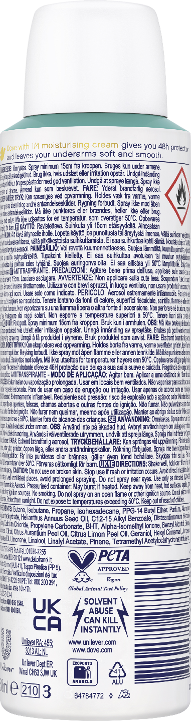 Kun tarvitset deodoranttia, joka tuntuu kuin raikas tuulen henkäys ihollasi, ota käteen Dove 48h Fresh antiperspirantti deodorantti roll-on. Dove deodorantti pitää kainalosi miellyttävän kuivina ja hoitaa kainaloidesi herkkää ihoa. Dove antiperspirantti pitkäkestoisella tuoksulla auttaa sinua aloittamaan päiväsi itsevarmasti. Nauti raikkaan antiperspirantti roll-onin puhtaasta tuoksusta tunnista toiseen. Dove yhdistää hellävaraisen kainaloiden hoidon pitkäaikaiseen, 48 tunnin hikoilusuojaan, jotta sinä voit tuntea olosi varmaksi myös silloin, kun on aika paljastaa kainalot. Alkoholiton antiperspirantissa on mukana Doven kosteusvoide, minkä ansiosta kainalosi tuntuvat ihanan pehmeiltä ja sileiltä. Tämä deodorantti roll-on tarjoaa raikkautta pitkäksi aikaa hajuja torjuvan teknologian ansiosta. Saat tarvitsemasi suojan hikoilua vastaan yhdistettynä Doven hoitavaan vaikutukseen. Ainutlaatuisen ja hellävaraisen hoitavan vaikutuksen ansiosta Dove rauhoittaa ihoärsytystä. Antiperspirantin puhdas tuoksu auttaa sinua aloittamaan päiväsi aina yhtä luottavaisena. Saat eniten irti 48 tunnin antiperspirantista, kun levität tätä alkoholitonta antiperspiranttideodoranttia tasaisesti kumpaankin kainaloon. Levitä tarpeen mukaan lisää päivän aikana. Saat parhaan deodoranttisuojan, kun varmistat, että kainalot ovat puhtaat ja kuivat ennen levittämistä. Tämä antiperspirantti sopii täydellisesti juuri sinulle, joka haluat olla varma siitä, että tunnet olosi raikkaaksi ja virkeäksi tunnista toiseen. Hyvä idea on säilyttää deodoranttia kodin kylpyhuoneen lisäksi esimerkiksi työpaikalla työpöydän laatikossa. Laita myös yksi Dove roll-on mukaan kuntosalilaukkuusi. Dove Fresh antiperspirantti deodorantti roll-on suojaa parhaalla tavalla hikoilulta sekä torjuu pahoja hajuja ja epämiellyttäviä tuoksuja. Dove on PETA Cruelty Free -sertifioitu.