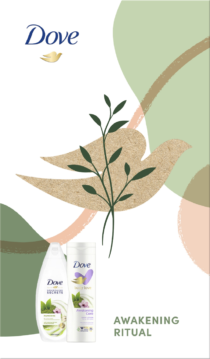 Dove Care by Nature Mixed Xmas Awakening Ritual -lahjapakkaus sisältää suihkusaippuan ja kosteuvoiteen. Valloittava lahjaidea: raikas tunne ja kosteutettu iho!Valmistaudu herättämään aistejasi ja ravitsemaan ihoasi luonnonvoimaisella vartalonpuhdistusaineellamme – UUSI Dove Care by Nature Awakening Ritual -suihkusaippua sisältää kosteuttavia ainesosia. Kuiva iho saa välittömästi uudenlaista pehmeyttä ja tuntuu sileämmältä – jo ensimmäisen suihkun jälkeen. Dove Care by Nature Awakening Ritual hoitaa ja pehmentää ihoa välittömästi ja ravitsee pitkäkestoisesti. Se on hellä iholle. Dove Care by Nature Awakening Ritual on perusteellisesti puhdistava, mieto ja kosteuttava suihkugeeli. Se on sisältää tarkkaan valikoituja uutteita ja hoitavia öljyjä. Suihkusaippua pesee tehokkaasti pois lian ja muut epäpuhtaudet poistamatta iholta sen luonnollista kosteutta. Dove Care by Nature Awakening Ritual -kosteusvoide on saanut vaikutteita Japanin perinteikkäistä kauneusrituaaleista. Kosteusvoiteen virkistävä koostumus sisältää matcha-teetä ja kirsikankukkia. Se kosteuttaa ihoa ja jättää sille ihanan tuoksun. Matcha-teen voimaannuttava vihreän teen tuoksu antaa sinulle mielenrauhaa ja tukee keskittymiskykyäsi heti aamusta alkaen. Aistikas kirsikankukka auttaa pitämään ihon silkin pehmeänä. On tärkeää, että tunnet oman ihosi, kun etsit tuotetta, joka sopii sinulle parhaiten. Kun tiedät ihosi tarpeet, voit valita vartalollesi sopivan suihkusaippuan, deodorantin tai vaikka kosteusvoiteen, joka esimerkiksi ravitsee tai auttaa palauttamaan ihon kimmoisuutta ja kiinteyttä. Dove on yksi maailman rakastetuimmista kauneusbrändeistä. Dove uskoo, että kauneus kuuluu kaikille. Haluamme kauneuden olevan itsetunnon eikä ahdistuksen lähde. Autamme maailman naisia kehittämään myönteisen suhteen omaan ulkonäköönsä, kohentamaan itsetuntoaan ja saavuttamaan täyden potentiaalinsa.