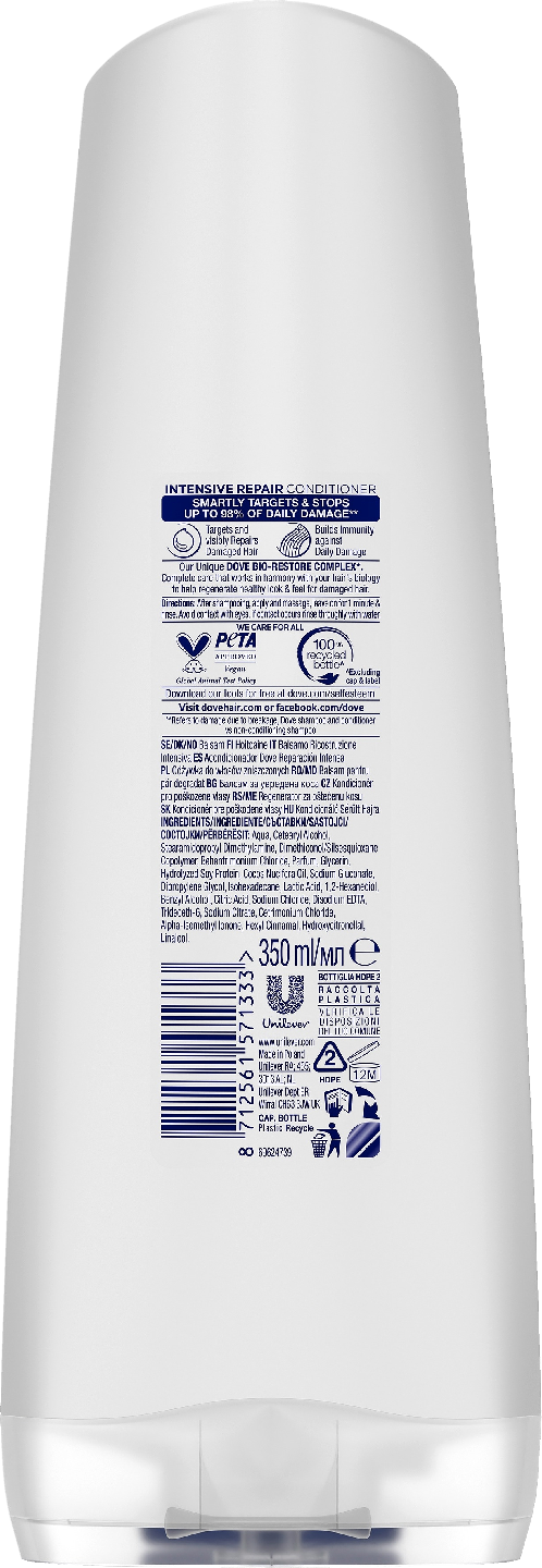 Dove Intensive Repair -hoitoaine on vaurioituneiden hiusten hoitoaine, joka vahvistaa ja ravitsee hiuksia sisältäpäin. Sekä välittömästi että pitkällä aikavälillä. Hiusten pinnalta sekä syvästi. Intensiivisesti hoitavalle hoitoaineelle on suuri tarve. Varsinkin kun otetaan huomioon, kuinka paljon hiukset altistuvat rasitukselle päivä päivältä, viikko toisensa jälkeen. Joskus siksi, että värjäämme hiuksemme. Joskus hiusten muotoilun jälkeen. Ja joskus siksi, että sää sotkee hiuksemme. Mutta jopa kaikkein vaurioituneimmat hiukset voivat saada takaisin kiiltonsa ja näyttää terveiltä ja kauniilta asianmukaisella ravinnolla ja hoidolla. Dove Intensive Repair -hoitoaine korjaa ja vahvistaa hiuksia. Sekä syvältä sisältä että hiusten pinnalta. Hoito perustuu koostumukseen, jonka ytimessä on Doven Nutri-Keratin Repair Actives -teknologia. Koostumus korjaa pinnallisesti näkyvät vauriot ja ravitsee hiuksiasi. Hiuksista tulee vahvemmat ja näkyvästi terveemmät ja kauniimmat jokaisella pesulla. Niitä on helpompi hallita ja helpompi harjata. Pakkaus voidaan kierrättää 100-prosenttisesti. Dove on yksi maailman rakastetuimmista kauneusbrändeistä. Naiset ovat aina innostaneet Dovea. Dove on alusta alkaen tehnyt kaikkensa tarjotakseen naisille korkealaatuisia hoitavia tuotteita. Dove uskoo, että kauneus kuuluu kaikille ja haluaa kauneuden olevan itsetunnon eikä ahdistuksen lähde. Siksi Dove haluaa auttaa maailman naisia kehittämään myönteisen suhteen omaan ulkonäköönsä, kohentamaan itsetuntoaan ja saavuttamaan täyden potentiaalinsa. Globaalisti, Dove ei testaa eläimillä ja on PETA-sertifioitu.