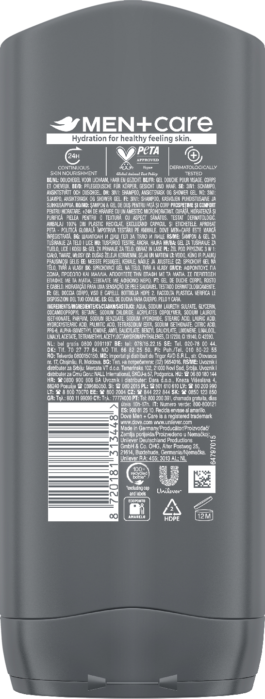 Dove Men+Care Clean Comfort -suihkusaippua on miehille tarkoitettu tuoksuva suihkusaippua, jolla peset koko vartalon ja kasvot. Dove Men+Care suihkusaippua poistaa bakteereja ja hajuja. Samalla se hoitaa ja kosteuttaa ihoa tehokkaasti ja suojaa sitä kuivumiselta. Iho tuntuu raikkaalta ja pehmeältä. Dove Men+Care Clean Comfort -suihkusaippuan ainutlaatuinen MicroMoisture-teknologia aktivoituu, kun saippua vaahtoaa. MicroMoisture-teknologia auttaa säilyttämään ihon luonnollisen kosteuden ja estää sen, että iho kuivuu. Käytä näin! Hiero suihkusaippuaa käsissäsi kevyesti, jotta saat suihkusaippuan vaahtoamaan. Hiero suihkusaippuaa vartalolle ja kasvoille. Huuhtele perusteellisesti. Dove Men+Care -suihkusaippuan ansiosta tunnet olosi raikkaaksi koko päivän. Dove Men+Care Clean Comfort on geelimäinen suihkusaippua, joka dermatologisesti testattu. Tuote on hellävarainen ihon mikrobiomille – ihosi elävälle suojakerrokselle. Näin saat aamuisin suihkussa parhaat tulokset: • Kun peset hiukset ensin, ihollesi jääneet shampoojäämät huuhtoutuvat pois vartalon pesun aikana. • Oikeanlainen miesten suihkusaippua, kuten Dove Clean Comfort, pesee tehokkaasti jättämättä ihoa kuivan tuntuiseksi. Kun peset kasvot suihkussa viimeiseksi, kasvot jäävät kosteiksi parranajoa varten, mikä takaa sileämmän ajon. • Dove-suihkusaippua on tarkoitettu koko vartalon pesuun, joten se sopii erinomaisesti myös kasvojen puhdistukseen. Onko ongelmasi hilse? Se koskettaa lähes joka toista meistä joskus, joten sen käsittelemiseen on selvät konstit ja omat shampoot. Tällainen tuote on esimerkiksi Dove Men+Care Anti Dandruff shampoo, joka paitsi poistaa hilsettä myös vahvistaa* hiuksia. Globaalisti, Dove Men+Care ei testaa eläimillä ja on PETA cruelty-free -sertifioitu. Pullomme ovat nyt ainutlaatuisella tavalla kauniita. Olemme siirtymässä käyttämään kokonaan kierrätysmuovista valmistettuja muovipulloja.