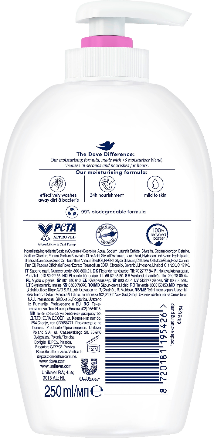 Tiesitkö, että oikeanlaisella käsisaippualla voit muuttaa käsienpesun myös ihonhoidoksi? Me kaikki pesemme kädet hieman tavallista useammin nykyään. Siksi on entistä tärkeämpää pitää käsiemme ihosta hyvää huolta, varsinkin silloin kun ne tuntuvat kuivilta tai iho kireältä. Jos kätesi kuivuvat kaikesta saippuapesusta, Dove Renewing Care -käsisaippua on oikea valinta sinulle. Sen tehokas antibakteerinen puhdistuskoostumus sisältää ainutlaatuisen 5 x Moisturizer Blend -yhdistelmän. Yhdistelmä koostuu viidestä ihon ravintoaineesta ja kosteuttajasta. Tunnet kätesi pehmeiksi, sileiksi, ravituiksi ja suojatuiksi jokaisen käsienpesun jälkeen. Dove Renewing Care -käsisaippuan sisältämä ruusuöljy ja pioni tuovat lisäksi ripauksen kukkaistuoksuista hemmottelua jokaiseen päivääsi. Dove Renewing Care on koostumukseltaan 99-prosenttisesti biohajoava. Saippua ei siis ole hyvä vain hoitamaan ja pitämään parempaa huolta ihostasi, vaan se pitää parempaa huolta myös ympäristöstämme. Käyttö: Doven pumppupullo on helppo käyttää. Annostele runsas määrä Dove-käsisaippuaa käsiisi ja hiero käsiäsi yhteen, kunnes ne vaahtoavat kunnolla. Varmista erinomainen käsihygienia hieromalla saippuaa käsiin ja käsivarsiin huolellisesti. Pese tämän jälkeen kätesi – suositeltu aika vähintään 20 sekuntia. Huuhtele lopuksi kädet huolellisesti lämpimällä vedellä. Dove Renewing Care -käsisaippua poistaa lian ja bakteerit, mutta se myös kosteuttaa ja on hellävarainen iholle. Tutustu myös Doven suihkusaippuoihin. Paras kosteuttava suihkusaippua on hyvin ravitseva, kuten esimerkiksi Dove Deeply Nourishing -suihkusaippua. Saippuaan on lisätty luonnollisia puhdistavia ainesosia, jotka ovat hellävaraisia iholle. Suihkusaippua on hyvä myös ihosi mikrobiomille – sen elävälle suojakerrokselle. Globaalisti, Dove ei testaa eläimillä ja on PETA cruelty-free -sertifioitu.