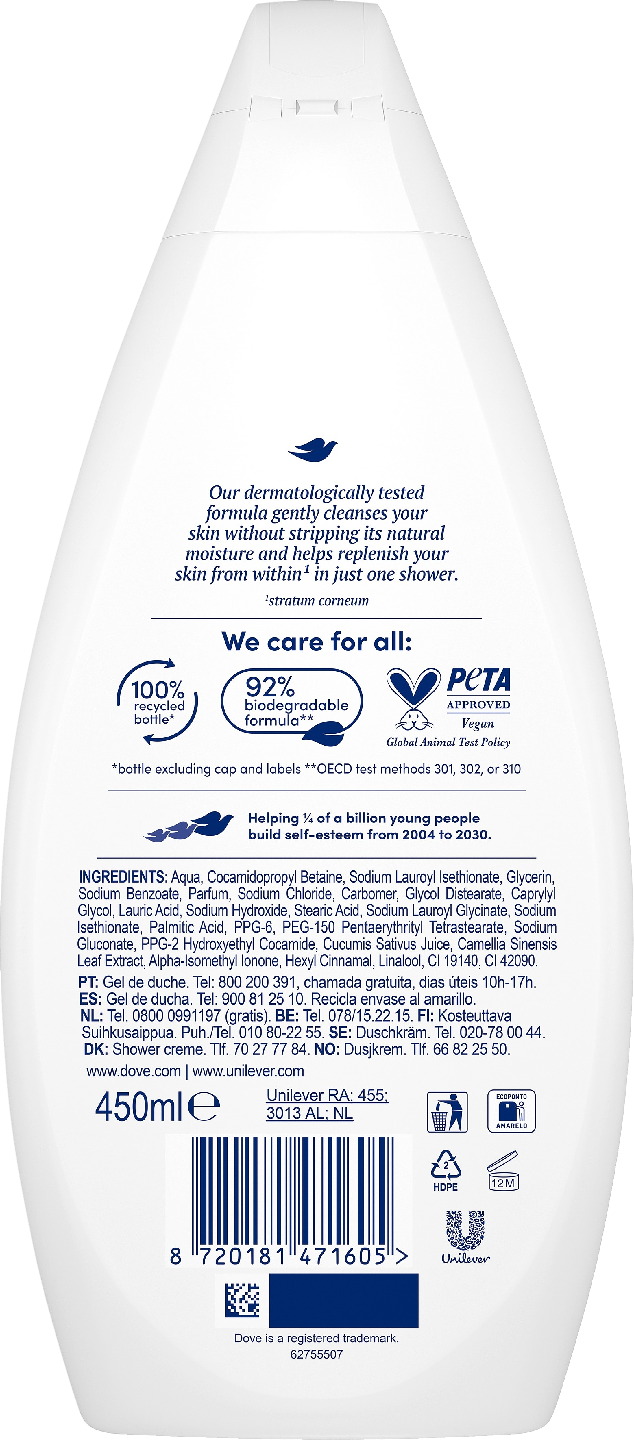 Dove Fresh Care -suihkusaippua puhdistaa hellävaraisesti ja hoitaa samalla ihoa. Jos etsit mietoa ja ravitsevaa suihkusaippuaa, Dove Fresh Care on valintasi. Se sisältää 100 %:sti hellävaraisia puhdistusaineita ja tekee ihosta pehmeämmän ja sileämmän jo yhdellä suihkukerralla. Mieto ja hellävarainen Dove Fresh Care on suunniteltu hellää puhdistusta kaipaavalle iholle. Se ei poista ihon luonnollista kosteutta, vaan pitää ihosi pehmeänä ja kosteutettuna. Dove Fresh Care sisältää ainoastaan mietoja puhdistusaineita ja ihoa ravitsevia ainesosia eikä se kuivata ihoa. Dermatologisesti testattu suihkusaippua ei sisällä SLES-sulfaatteja, vaan se on hellävarainen mikrobiomille – ihon elävälle suojakerrokselle. Itsestä huolehtiminen on tärkeää ja Dove huolehtii kaikista. Dove Fresh Care -suihkusaippua on hellävarainen vartalon pesuaine, joka auttaa pitämään huolta ihostasi ja joka tekee jokaisesta suihkuhetkestä ihanan hemmottelutuokion. Samalla se tekee ihostasi pehmeämmän ja sileämmän jo yhdellä pesukerralla. Käytä Dove Fresh Care -suihkusaippuaa kostutetulle iholle, purista saippuaa kämmenelle ja hiero vartaloon. Huuhtele pois ja tunne, kuinka ihosi tuntuu kosteutetulta ja pehmeältä kuin silkki. Kostea iho on vastaanottavaisempi voiteille ja seerumeille, joten suihkun jälkeen on oiva hetki varmistaa, että kosteus pysyy iholla. Suihkun jälkeen iholle kannattaakin levittää Dove-kosteusvoide. Doven visiona on maailma, jossa kauneus herättää itseluottamusta eikä ahdistusta. Siksi Dove on ottanut tehtäväkseen auttaa seuraavaa sukupolvea luomaan myönteisen suhteen omaan ulkonäköönsä. Lisäksi Dove on sitoutunut vähentämään muovijätettä ja se pyrkiikin osaltaan puuttumaan maailmanlaajuiseen kauneudenhoitoalan muovijäteongelmaan. Dove Fresh Care -suihkusaippuan koostumus on 92-prosenttisesti biohajoava*. Pullo on valmistettu kokonaan kierrätysmuovista**. Lisäksi Doven tuotteita ei testata koskaan eläimillä missään päin maailmaa. Yritys on saanut PETA Vegan Cruelty Free -sertifioinnin. *OECD-testimenetelmät 301, 302 tai 310 **korkki ja etiketti pois lukien