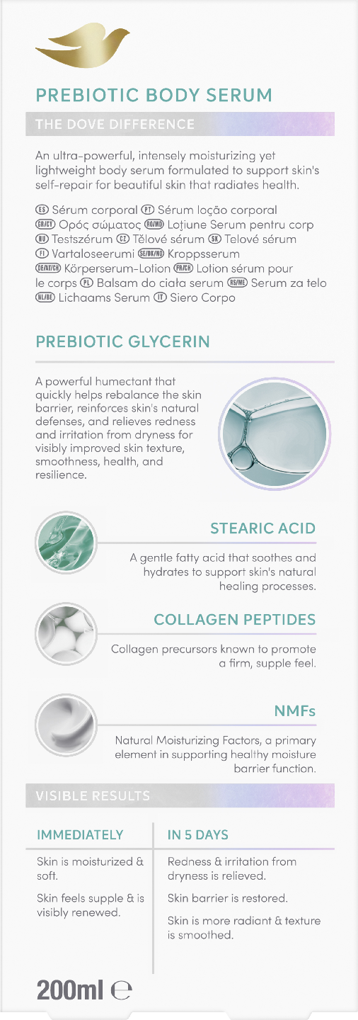 Ihon näkyvä terveys ja hehku voivat heikentyä monien tekijöiden vuoksi, mikä voi johtaa epätasapainoiseen ihon suojakerrokseen, punoitukseen ja ärsytykseen kuivuudesta, sameuteen tai herkkyyteen. Ratkaisu: Dove Prebiotic + Sensitive Vartaloseerumi – rasvaton, nopeasti imeytyvä ja kevyt vartaloseerumi, joka on valmistettu tehokkaista kasvojenhoidon ainesosista tarjotakseen huipputason ihonhoitoa koko vartalolle. Se sisältää prebioottista glyseriiniä, steariinihappoa ja kollageenipeptidejä, ja tämä tehokas vartaloseerumi tarjoaa enemmän kuin 72 tunnin kosteutuksen – se tukee ihon luonnollista uudistumisprosessia ja antaa näkyviä tuloksia: uudistaa ihon suojakerroksen, lievittää kuivuudesta johtuvaa punoitusta ja ärsytystä sekä tasoittaa ihon rakennetta, jolloin iho näyttää näkyvästi terveeltä ja hehkuvalta. Tämä tieteeseen perustuva kosteuttaja on suunniteltu kaikille ihotyypeille ja -sävyille, ja sen sopivuus kuivalle ja herkälle iholle on kliinisesti todistettu. Läpikuultavan koostumuksensa ansiosta se sopii täydellisesti päivittäiseen käyttöön vartalovoiteen sijaan. Parhaan tuloksen saavuttamiseksi, käytä päivittäin vähintään viiden päivän ajan. Onko sinulla muita ihohuolia? Tutustu Dove-vartaloseerumisarjaan, joka on kehitetty yhteistyössä ihotautilääkäreiden kanssa tuomaan kasvojen seerumien teho ja vaikuttavuus vartalonhoitoon.