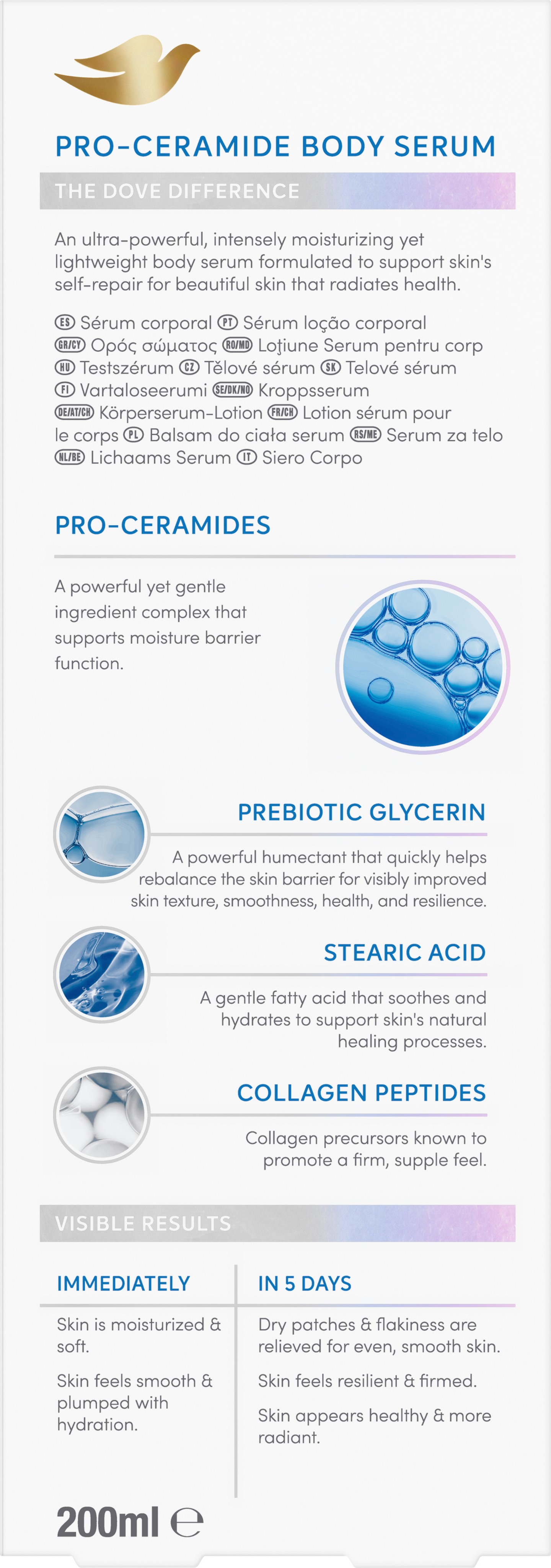 Näkyvä ihon terveys ja hehku voivat heikentyä monien tekijöiden vuoksi, mikä johtaa kosteussulun heikkenemiseen, kuivuuteen, kuiviin kohtiin, hilseilyyn, sameuteen tai kiinteyden puutteeseen. Ratkaisu: Dove Pro-Ceramide + Hydration -vartaloseerumi – rasvaton, nopeasti imeytyvä ja kevyt koko vartalon seerumi, joka on valmistettu tehokkaista kasvojenhoidon ainesosista tarjotakseen huipputason ihonhoitoa – nyt koko vartalolle. Seerumi sisältää pro-keramideja, prebioottista glyseriiniä, steariinihappoa ja kollageenipeptidejä. Tämä erittäin tehokas vartaloseerumi tarjoaa enemmän kuin 72 tunnin kosteutuksen – se tukee ihon luonnollista uusiutumisprosessia ja antaa näkyviä tuloksia. Se helpottaa kuivia kohtia ja hilseilyä, kosteuttaa ihoa tehokkaasti ja vahvistaa sen kimmoisuutta, jolloin iho tuntuu sileämmältä ja näyttää heleämmältä. Tämä tieteellisesti tutkittu kosteuttaja on suunniteltu kaikille ihotyypeille ja -sävyille, ja sen sopivuus erittäin kuivalle, hilseilevälle iholle on kliinisesti todistettu. Läpikuultava koostumus tekee siitä täydellisen päivittäiseen käyttöön vartalovoiteen sijaan. Parhaan tuloksen saavuttamiseksi käytä päivittäin vähintään 5 päivän ajan. Onko sinulla muita ihonhoidon tarpeita tai huolia? Tutustu Dove-vartaloseerumisarjaan, joka on kehitetty yhteistyössä ihotautilääkäreiden kanssa tuomaan kasvojen seerumien teho ja tehokkuus vartalonhoitoon.