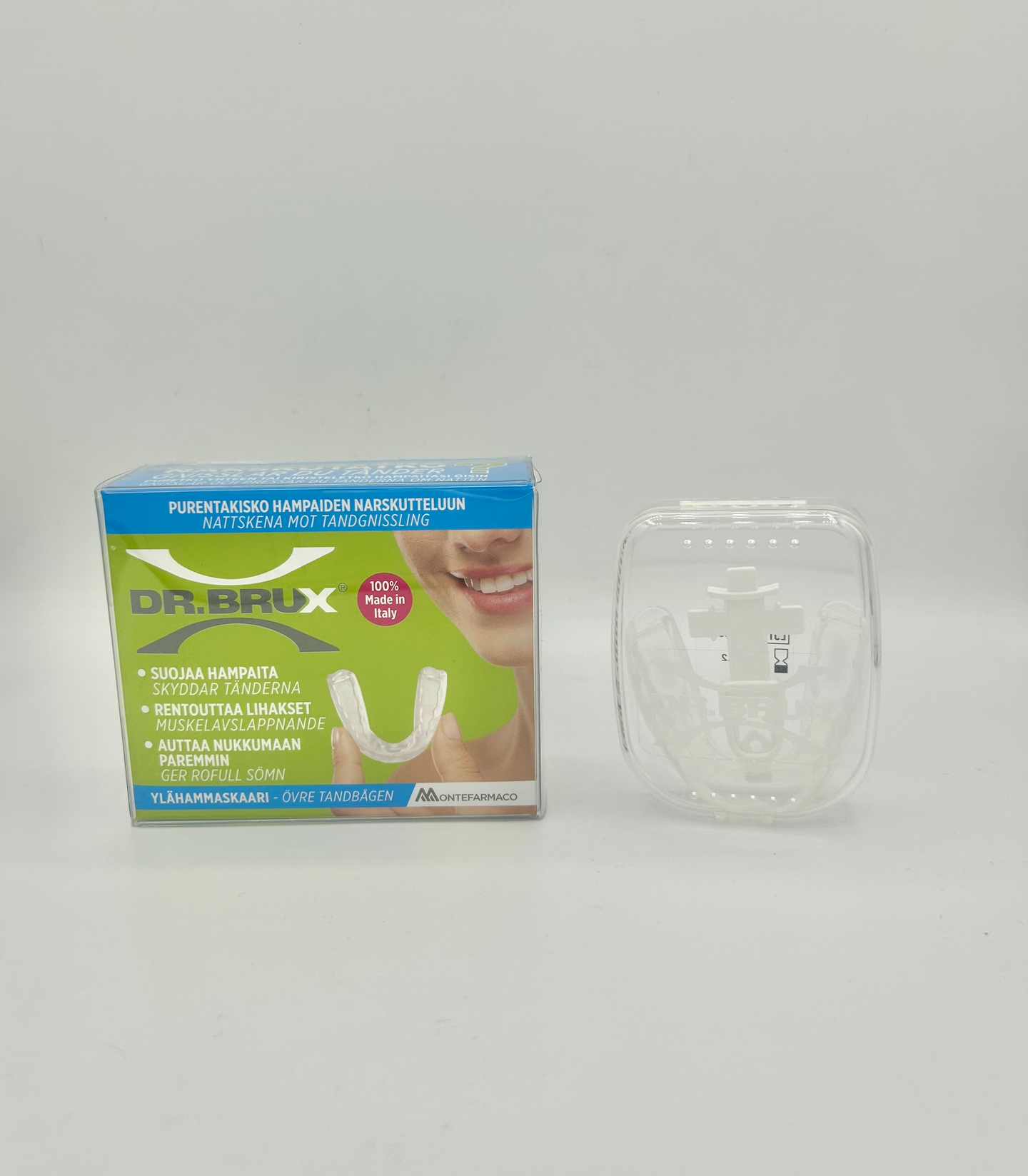 Dr. Brux – helpotusta hampaiden narskutteluun! Muotoiltava purentakisko suojaa hampaita, rentouttaa leukalihakset ja auttaa nukkumaan paremmin. Sopii yön aikana käytettäväksi ja muotoutuu täydellisesti omien hampaidesi mukaan vain muutamassa minuutissa. Valmistettu Italiassa. CE-merkitty lääkinnällinen laite.