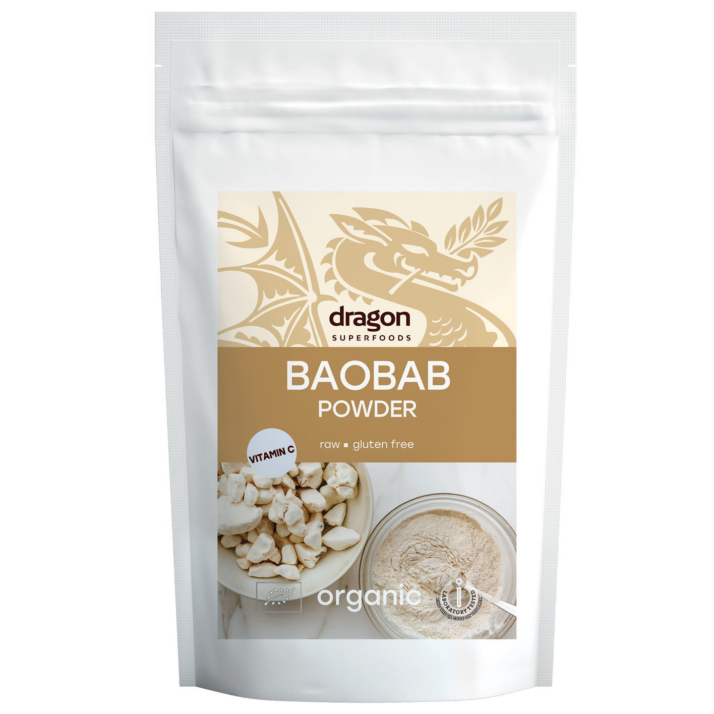 Dragon Superfoodsin luomulaatuinen baobab-jauhe on peräisin kasvin hedelmän hedelmälihasta, joka on kuivattu ja jauhettu hienoksi. Baobab (Adansonia digitata) on ollut afrikkalaisten alkuperäiskansojen arvostama puu jo vuosisatojen ajan ja se on nimetty ja tunnettu koko mantereella ”elämän puuna”. Sen hedelmät ovat kuitujen, kalsiumin ja magnesiumin lähde, ja niitä arvostetaan erityisesti niiden korkean C-vitamiinipitoisuuden vuoksi. Käytä tuotetta esimerkiksi smoothiessa, juomissa tai aamupalaan yhdistettynä.