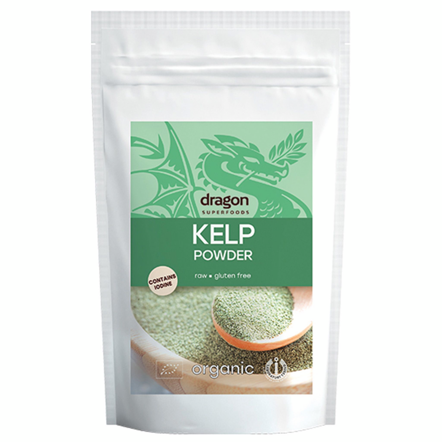 Dragon Superfoodsin luomulaatuinen kelp-jauhe (rakkolevä). Kelp on iso merilevälaji, jota kasvaa rannikoilla ympäri maailmaa. Se viihtyy etenkin avovesien äärellä ja on yksi nopeimmin kasvavista kasveista. Kelpin maku on merilevämäinen ja se toimiikin parhaiten yhdistettynä muihin ruokiin ja juomiin sekä smoothien sekaan. Kelp on hyvä jodin lähde ja se sisältää luonnostaan rautaa, mangaania, kalsiumia, magnesiumia, kuparia, sinkkiä, A-, B- ja C vitamiineja. Sisältää jodia noin 65100 µg / 100 g.