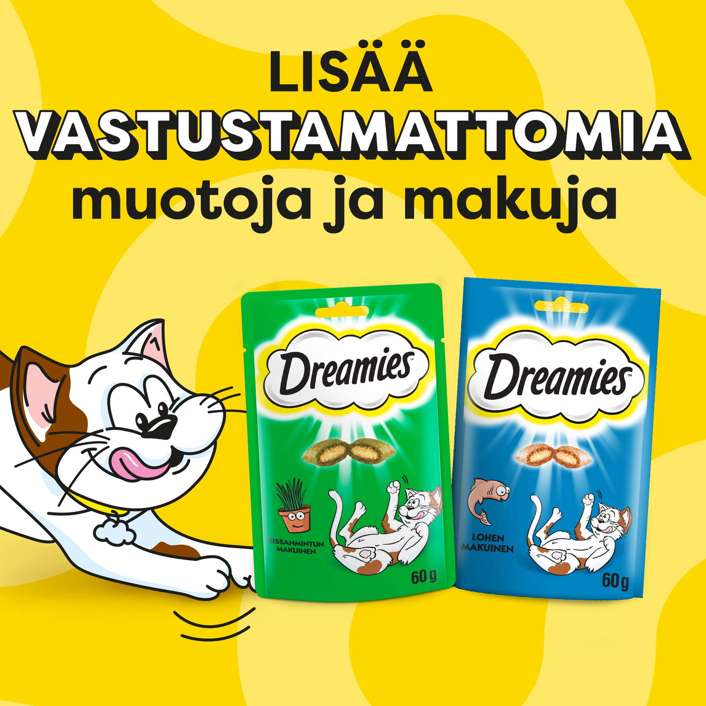 Herkullisen rapeita ulkoa ja pehmeitä sisältä. Kissojen on vaikea vastustaa herkullisia DREAMIES™-makupaloja. Emme käytä salaisia ainesosia tai taikuutta saadaksemme niistä maistuvia. Olemme vain täyttäneet ne herkullisella sisällöllä, josta kissat tykkäävät. Joten ravista purkkia niin kissa rientää luoksesi!