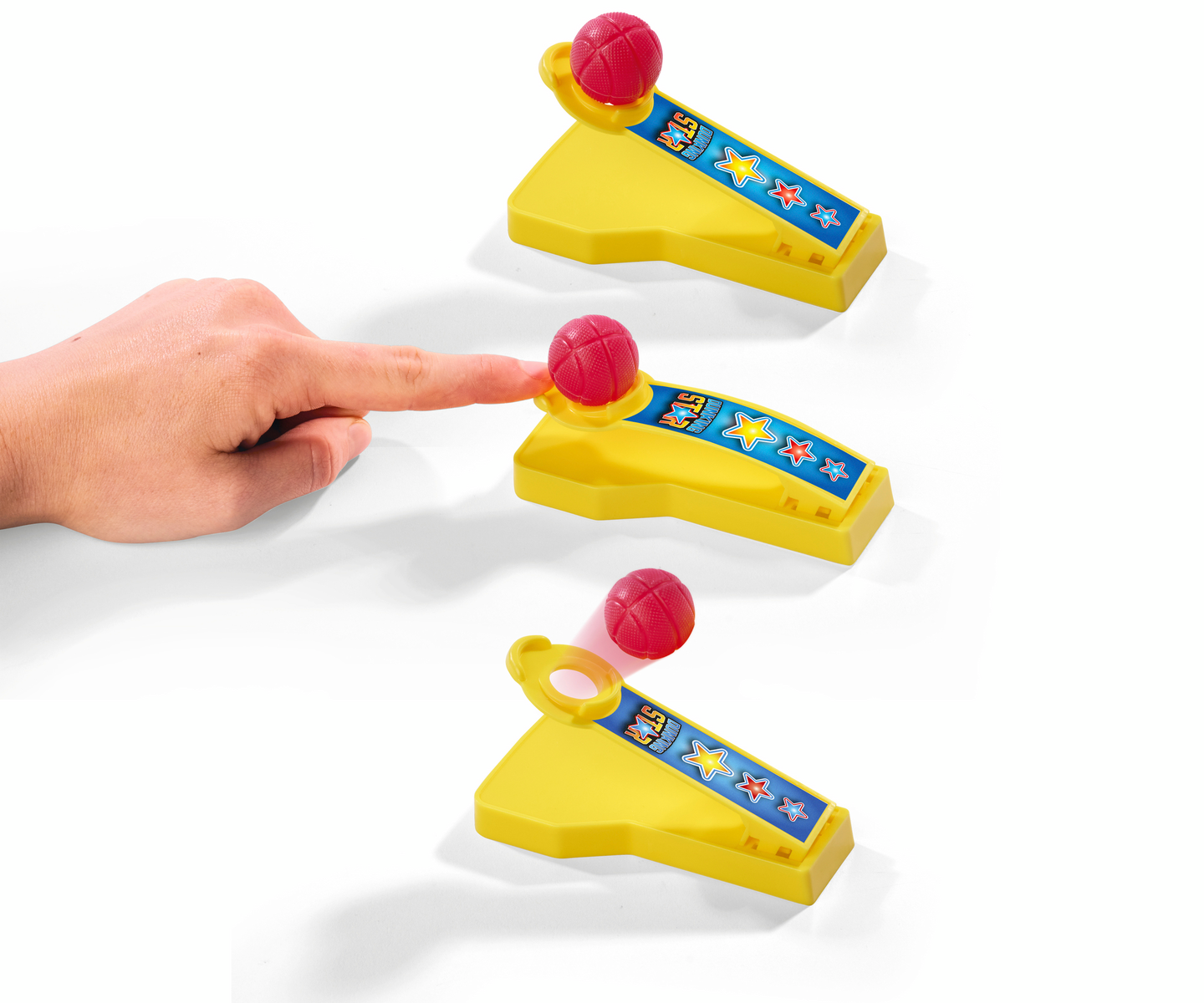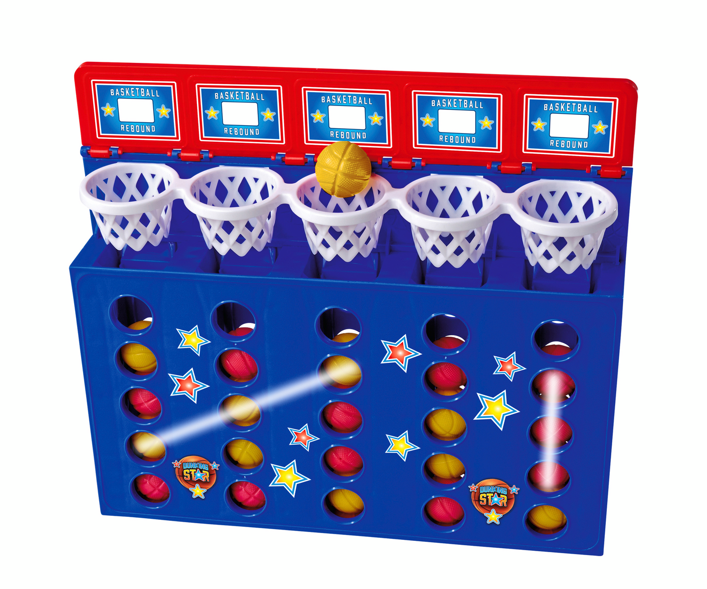 Sikta "dunkk" och vinn! Fyll korgarna på spelbrädan med tre bollar i rad – vertikalt, horisontellt eller diagonalt – för att vinna! Förpackningen innehåller spelbräda, 2 "dunkare"/skjutare, 26 bollar (13 röda och 13 gula) och klistermärken. Ett fartfyllt och roligt spel för 2 spelare eller lag. Rekommenderas för alla basketfans från 4 år och uppåt.