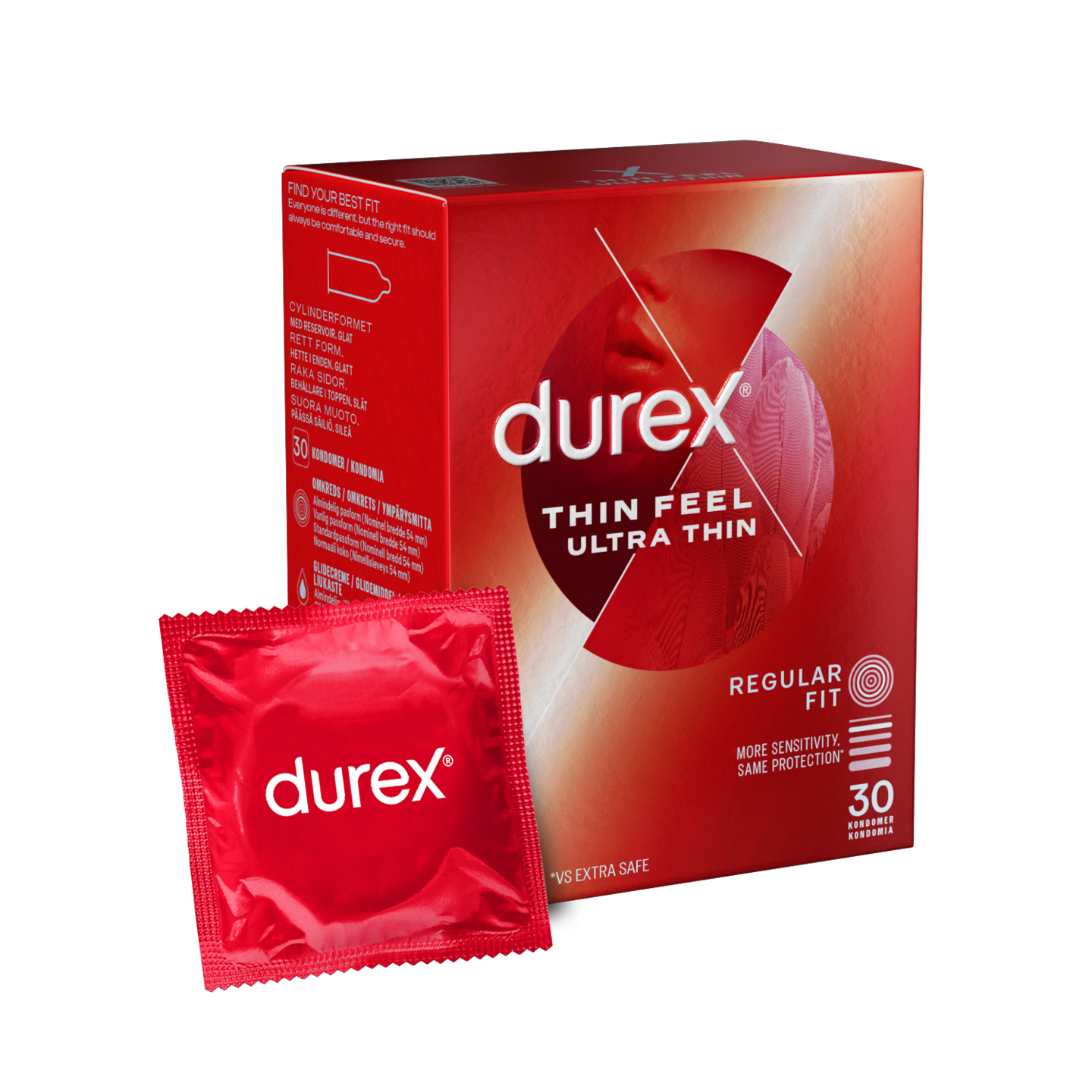 SUOSIKKIKONDOMISI UUDESSA PAKKAUKSESSA: Suosikkikondomisi ovat nyt uudessa pakkauksessa, jossa uusi raikas ilme. Ei huolta – sisältö on edelleen sama.Durex Thin Feel, Ultra Thin -kondomit lisäävät sinun ja kumppanisi tuntoherkkyyttä – tinkimättä turvallisuudesta ja suojaavuudesta, jota voit odottaa Durexilta. Kondomit on valmistettu ultraohuesta lateksista ja suunniteltu vielä ohuemmiksi, jotta tuntisit vielä enemmän. Kondomien nimellisleveys on 54 mm, ja ne on päällystetty silikonipohjaisella liukuvoiteella. Läpinäkyvissä, sylinterinmuotoisissa lateksikondomeissa on päässä säiliö, joten ne on helppo rullata paikalleen, ja niissä on parempi istuvuus seksin aikana.