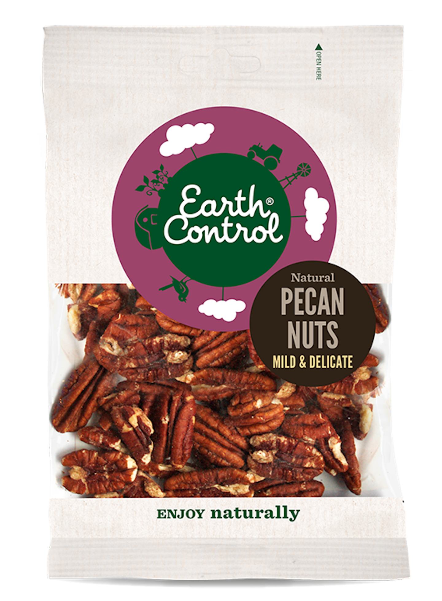 Earth Control Pekaanipähkinät on mieto, makea ja rapea rakenteeltaaan ja tekevät siitä sopivan välipalaksi heti pussista nautittuna. Voit myös käyttää herkullisia pekaanipähkinöitä vaniljajäätelön päälle tai leivonnaisten koristeena.