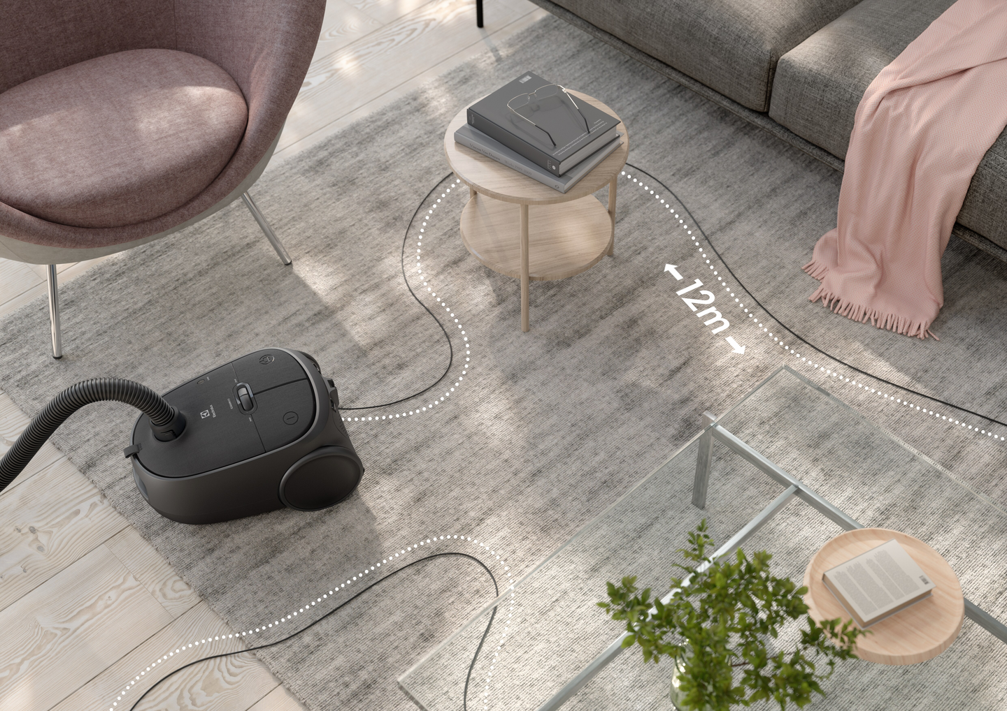 Helposti ohjattavien takapyörien ansiosta imurin käsittely eri lattiapinnoilla on helpompaa. 12 metrin ulottuvuuden ansiosta huoneesta toiseen siirtyminen käy sujuvasti.
