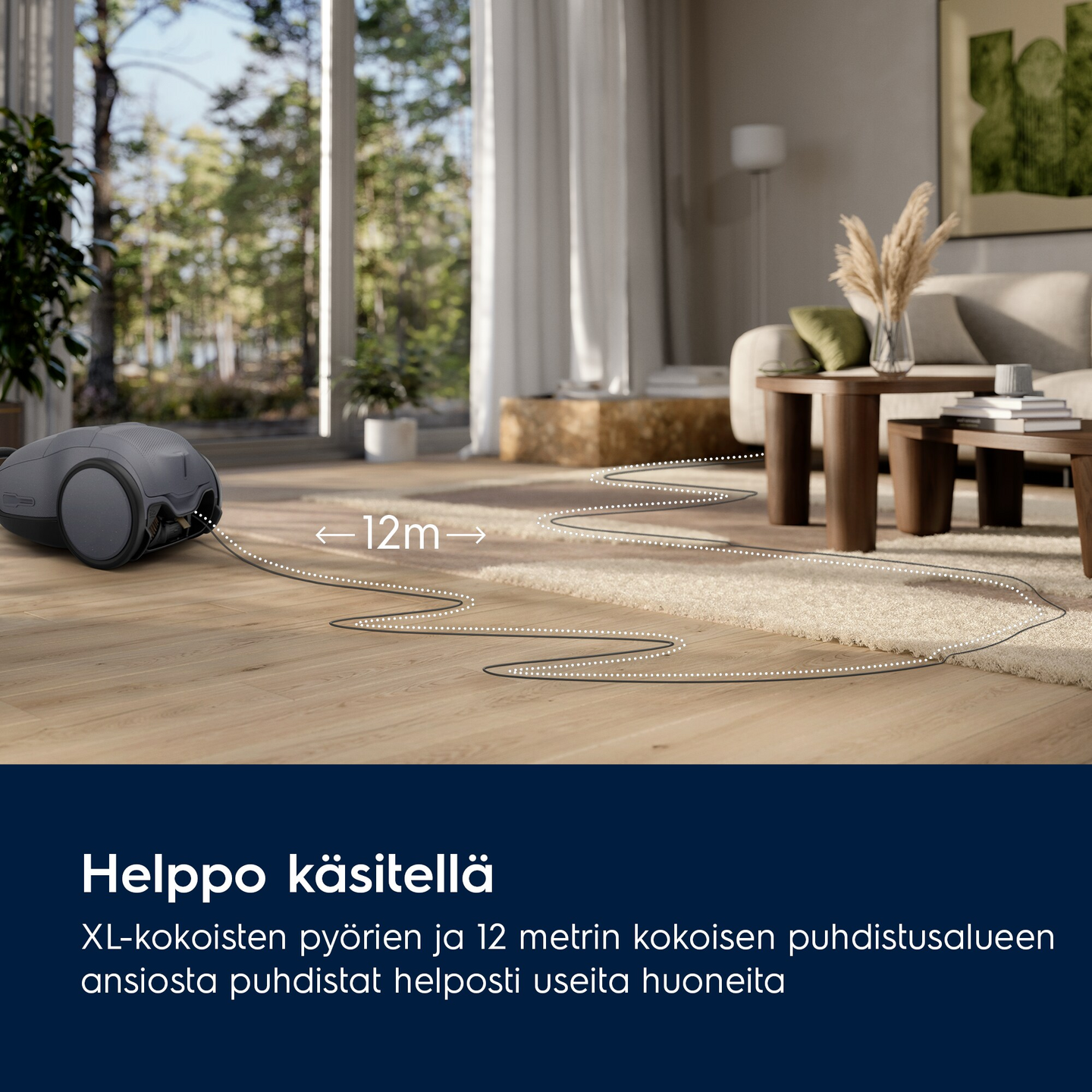 Suuret pehmeät pyörät kulkevat vaivattomasti, ovat hiljaiset ja suojelevat lattiapintaa.