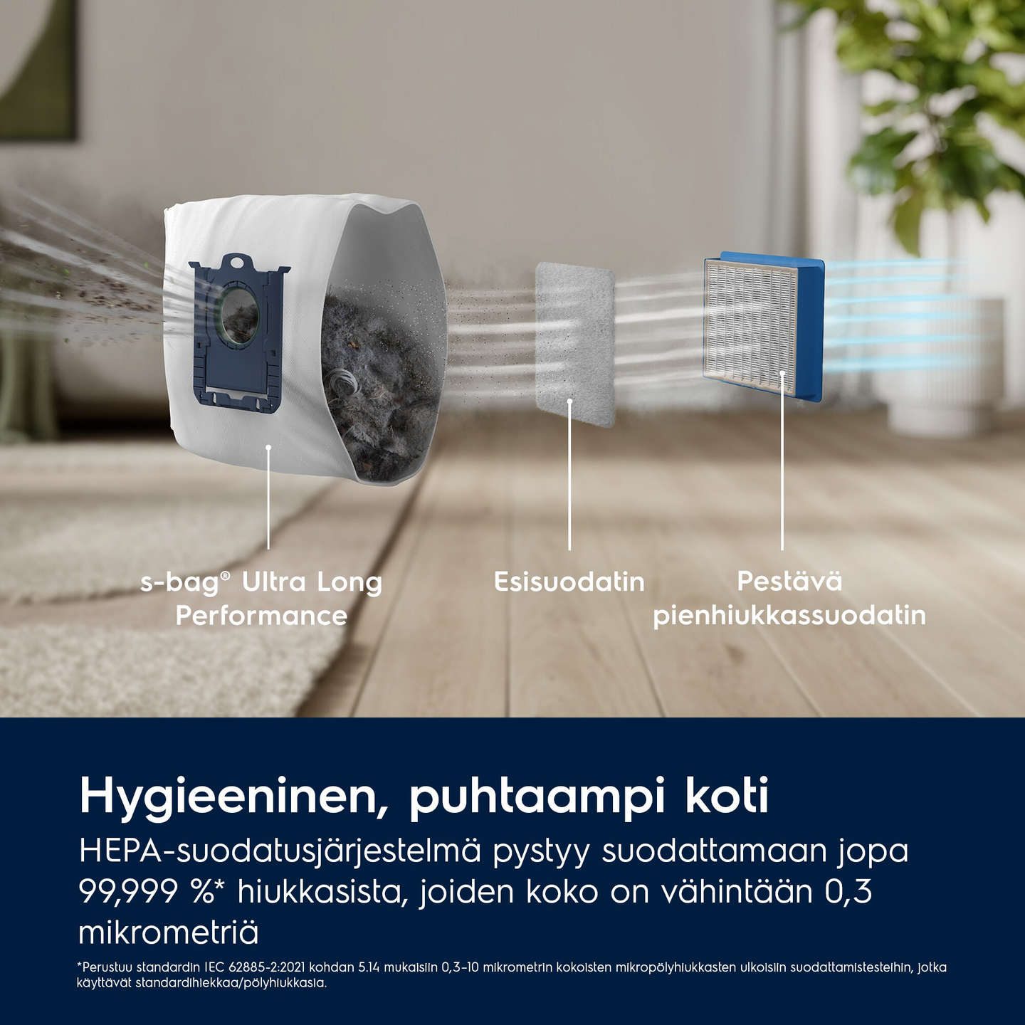 HEPA-suodatus kerää jopa 99,99%* mikropölystä partikkelit kooltaan >0.3µm ja palauttaa puhtaan ilman takaisin kotiisi. * Perustuu standardin IEC62885-2:2021, 5.14 mukaiseen ulkoiseen testiin mikropölyhiukkaskokojen 0,3-10 mikronin suodattamiseksi käyttäen standardihiekkaa/pölyhiukkasia.