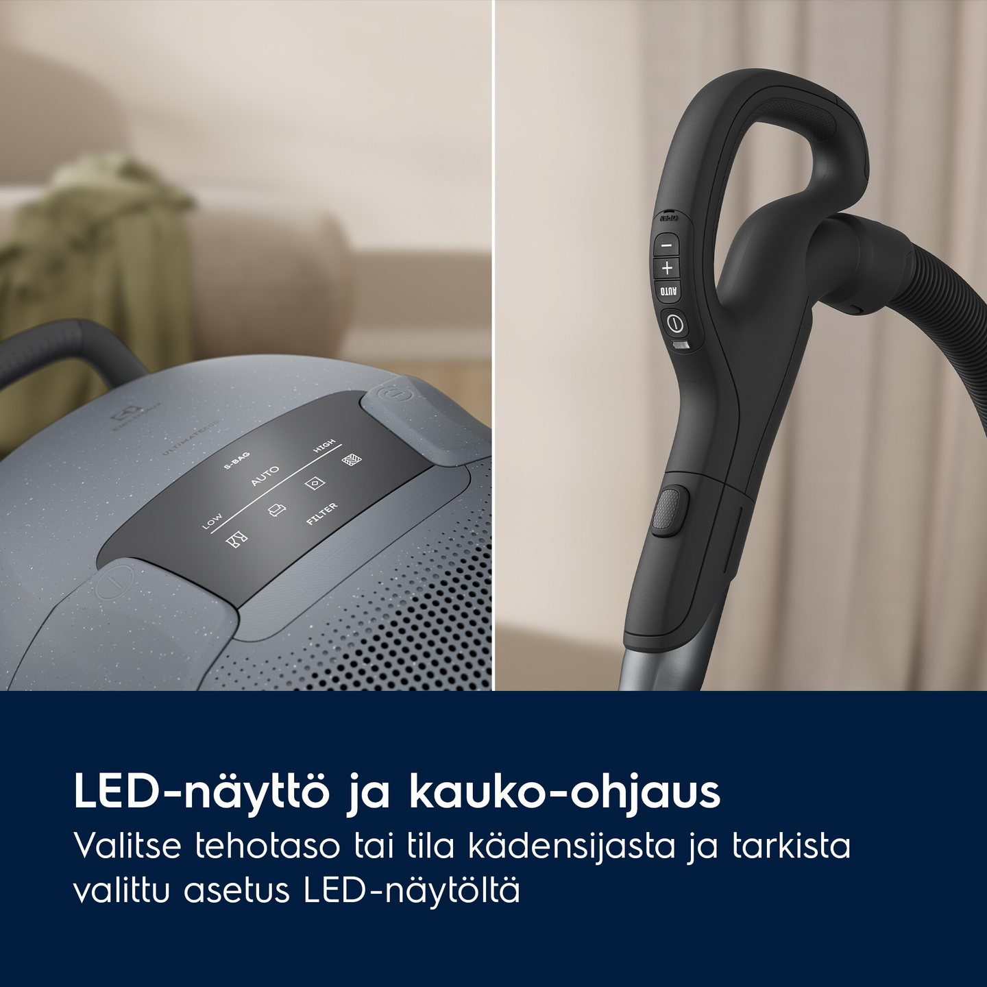 Digitaalinen näyttö ilmaisee LED-numeroin valitun imutehon. Lisäksi näytössä on merkkivalot, jotka kertovat pölypussin täyttymisestä ja suodattimen puhdistustarpeesta. Imuteho valitaan kädensijan elektronisilla +/- kaukosäätöpainikkeilla.