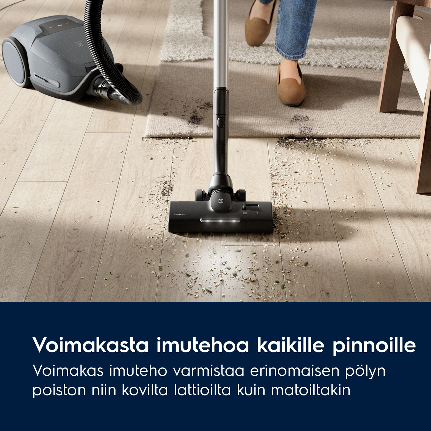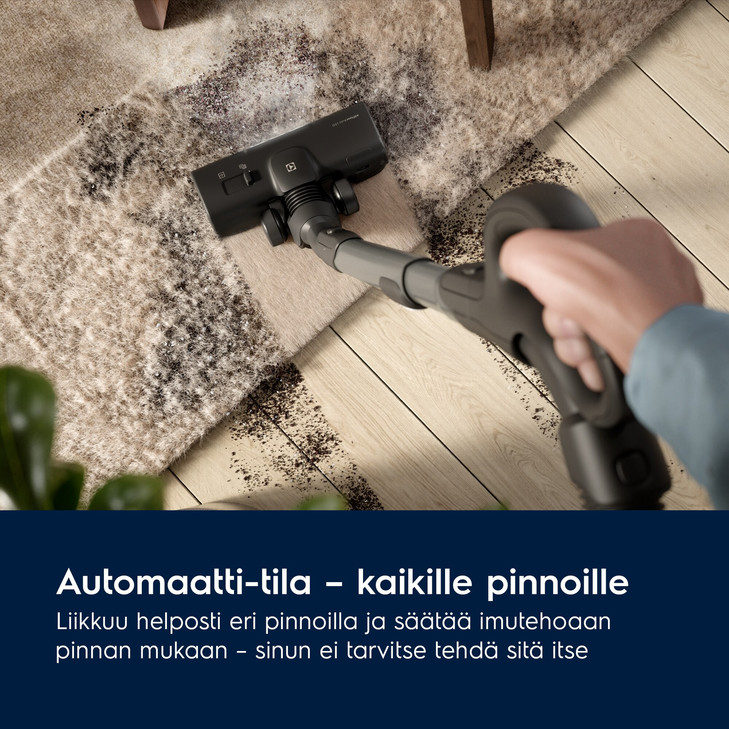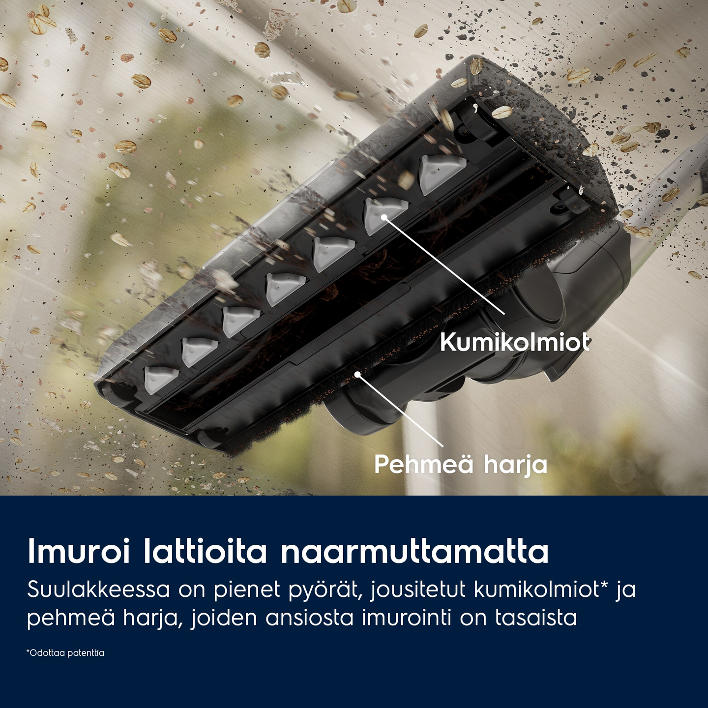AllFloor Auto LED suulakkeessa on innovatiiviset kumiset kolmiot* ja pehmeä harja, joiden ansiosta imurointi on helppoa ja tasaista. Suulake puhdistaa kaikki pinnat - matoista koviin lattioihin - ja poistaa pölyn 100 prosenttisesti** lattian raoista. *Patentti vireillä ** Perustuu standardin IEC62885-2:2021 mukaiseen sisäiseen testiin"
