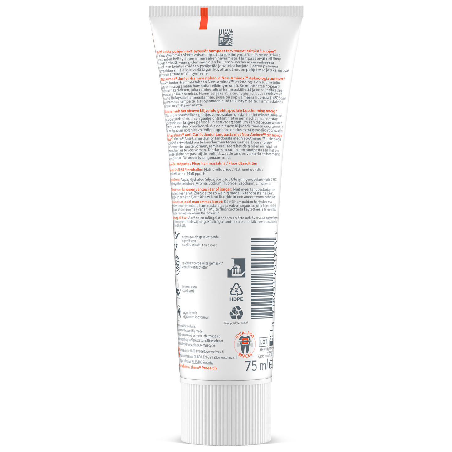 Lasten uudet, pysyvät hampaat tarvitsevat erityistä suojaa pysyäkseen vahvoina. elmex Junior 5-12 v. -hammastahna vahvistaa hampaita palauttamalla mineraaleja heikentyneeseen hammaskiilteeseen ja siten suojaa reikiintymiseltä. Kun pysyvät hampaat ovat juuri puhjenneita, niiden kiille ei ole vielä täysin kovettunut ja siksi erityisen altis reikiintymiselle. Varhaisessa vaiheessa reikiintyminen voidaan pysäyttää ahkeralla harjauksella ja reikiintymistä estävällä hammastahnalla. elmex Junior -hammastahna sisältää Neo-Aminex-teknologian, ja on suunniteltu erityisesti suojaamaan hampaita reikiintymiseltä. Tämä lasten hammastahna muodostaa nopeasti suojakerroksen, joka remineralisoi kiillettä sekä auttaa estämään mineraalien katoa. Tulee kierrätettävässä hammastahnatuubissa, ja koostumus on vegaaninen.