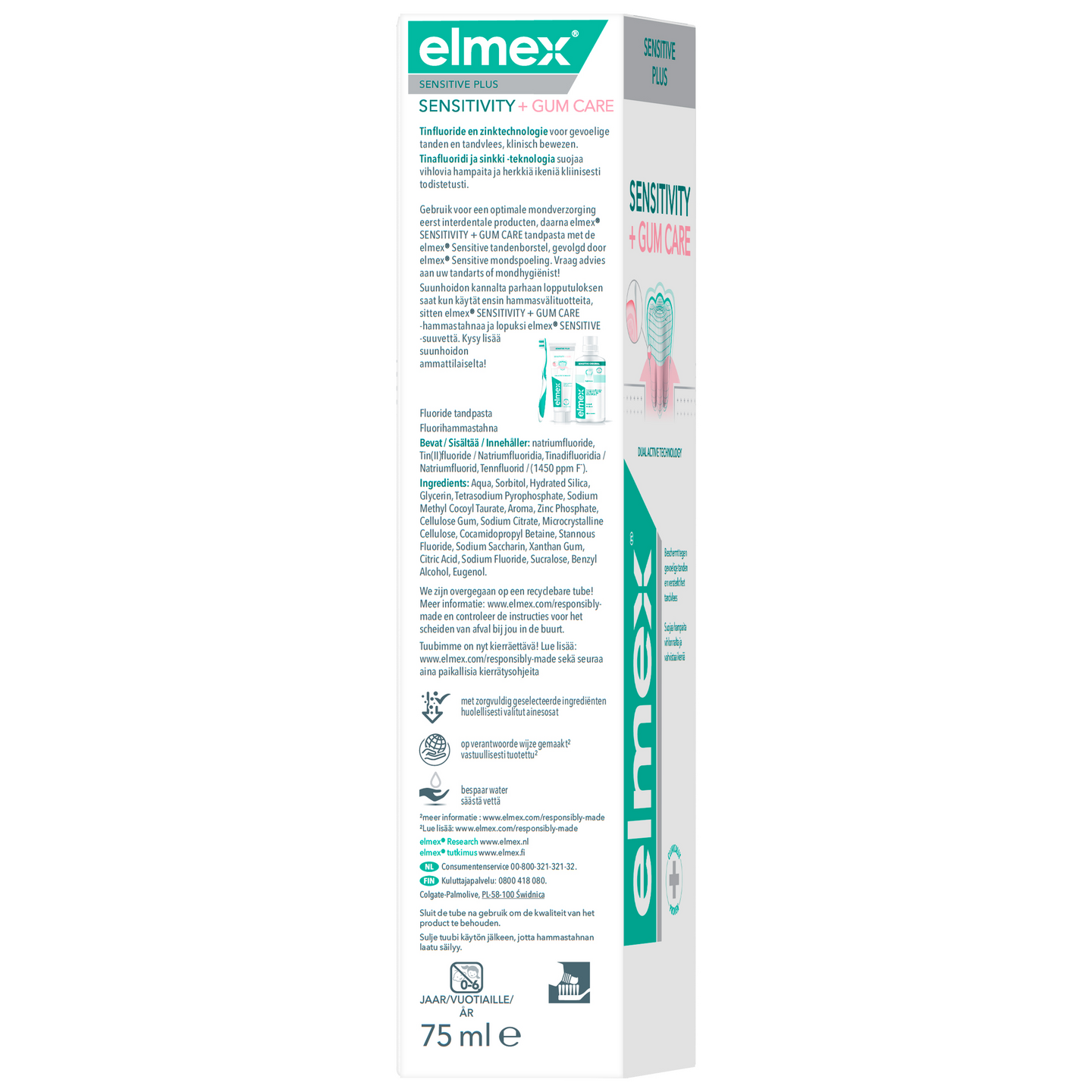 Suojaa hampaita vihlonnalta ja vahvista ikeniä elmex Sensitivity + Gum hammastahnan avulla. Usein vihlonta ja ärtyneet ikenet esiintyvät samanaikaisesti, ja elmex Sensitivity + Gum hoitaa molempia. Se sisältää kliinisesti todistetun tinafluoridi ja sinkki yhdistelmän, ja auttaa taistelemaan plakkibakteereja vastaan, jotka ovat yleisin syy ikenien verenvuotoon ja tulehdukseen. elmex-hammastahnatuubimme ovat nyt kierrätettäviä! Lue lisää: www.elmex.com/responsibly-made.
