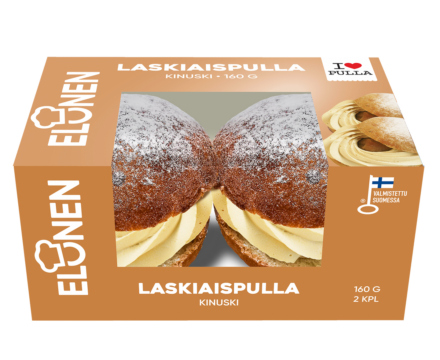 Perinteinen pulla kinuskitäytteellä ja kermavaahdolla.