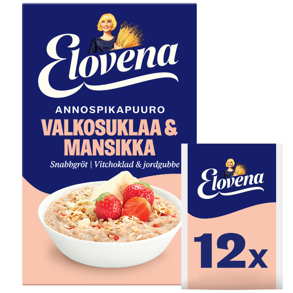 Elovena pikapuurossa yhdistyvät herkullinen valkosuklaan ja mansikan maku sekä kaurapuuron parhaimmat puolet. Runsaskuituisella herkkupuurolla taltutat makeannälän terveellisesti. Annospussista oma lempipuuro valmistuu kätevästi suoraan lautaselle, tarvitaan vain kiehuvaa vettä. Pakkauskoot 6 x 35 g ja 12 x 35 g. Tuote on valmistettu Suomessa suomalaisesta kaurasta. Tuotteelle myönnetty Sydänmerkki kertoo, että tuote on terveellisempi valinta omassa tuoteryhmässään.