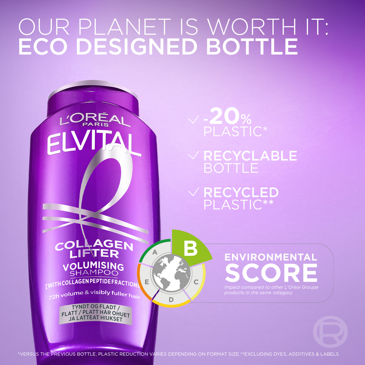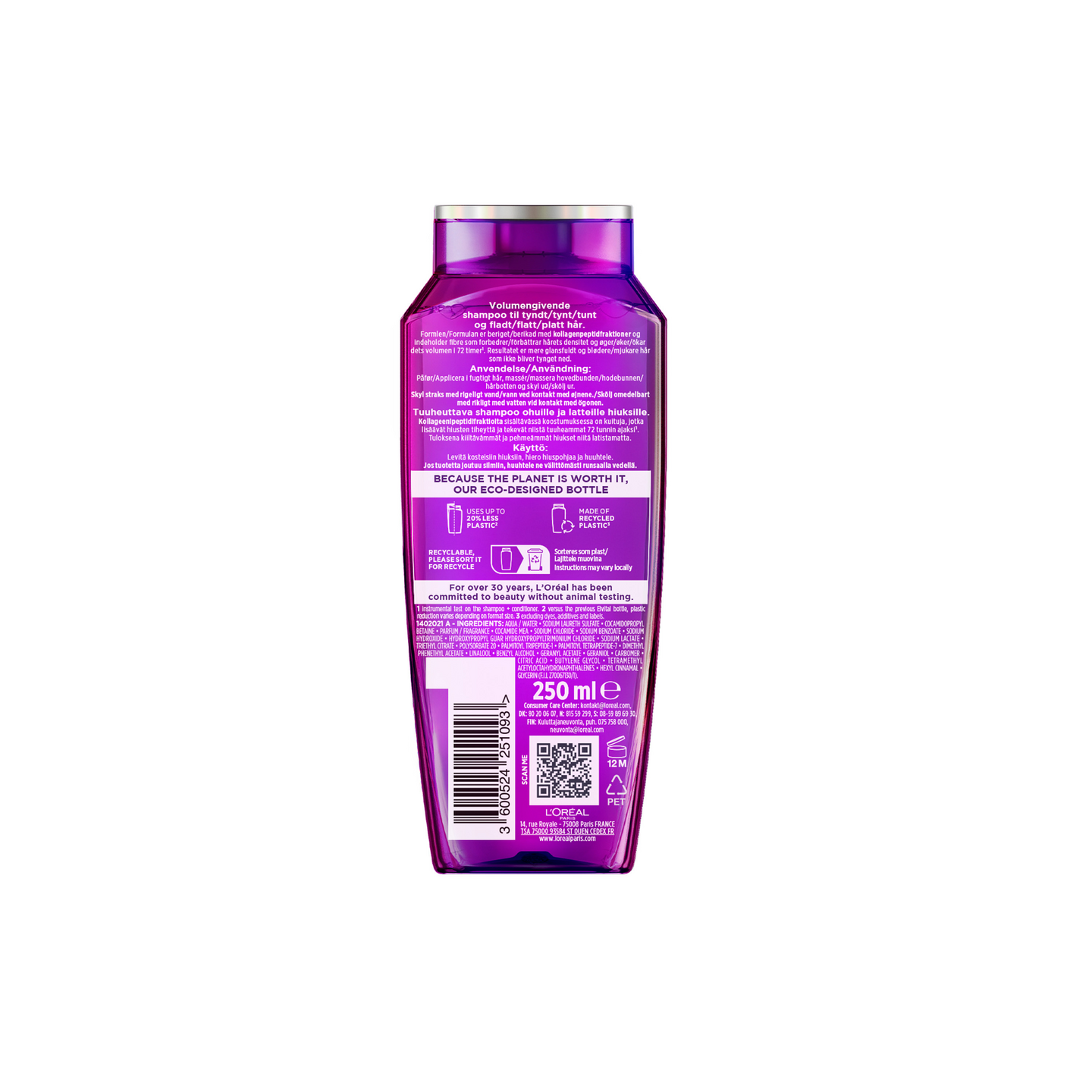 L'Oréal Paris Elvital Collagen Lifter tuuheuttava shampoo ohuille ja latteille hiuksille. Innovatiivinen koostumus sisältää kollageenipeptidifraktiota ja kuituja, jotka lisäävät hiusten tiheyttä ja tekevät niistä tuuheammat 72 tunnin ajaksi*. Sopii kaikille, jotka haluavat kiiltävän ja pehmeän lopputuloksen ilman latistavaa vaikutusta. • Tuuheuttava shampoo ohuille ja latteille hiuksille • Koostumus sisältää kollageenipeptidifraktioita • Koostumus sisältää myös kuituja, jotka lisäävät hiusten tiheyttä • Tuuheammat hiukset 72 tunnin ajaksi* • Kiiltävät ja pehmeät hiukset • Ei latista hiuksia *Mittaustulos, shampoo + hoitoaine