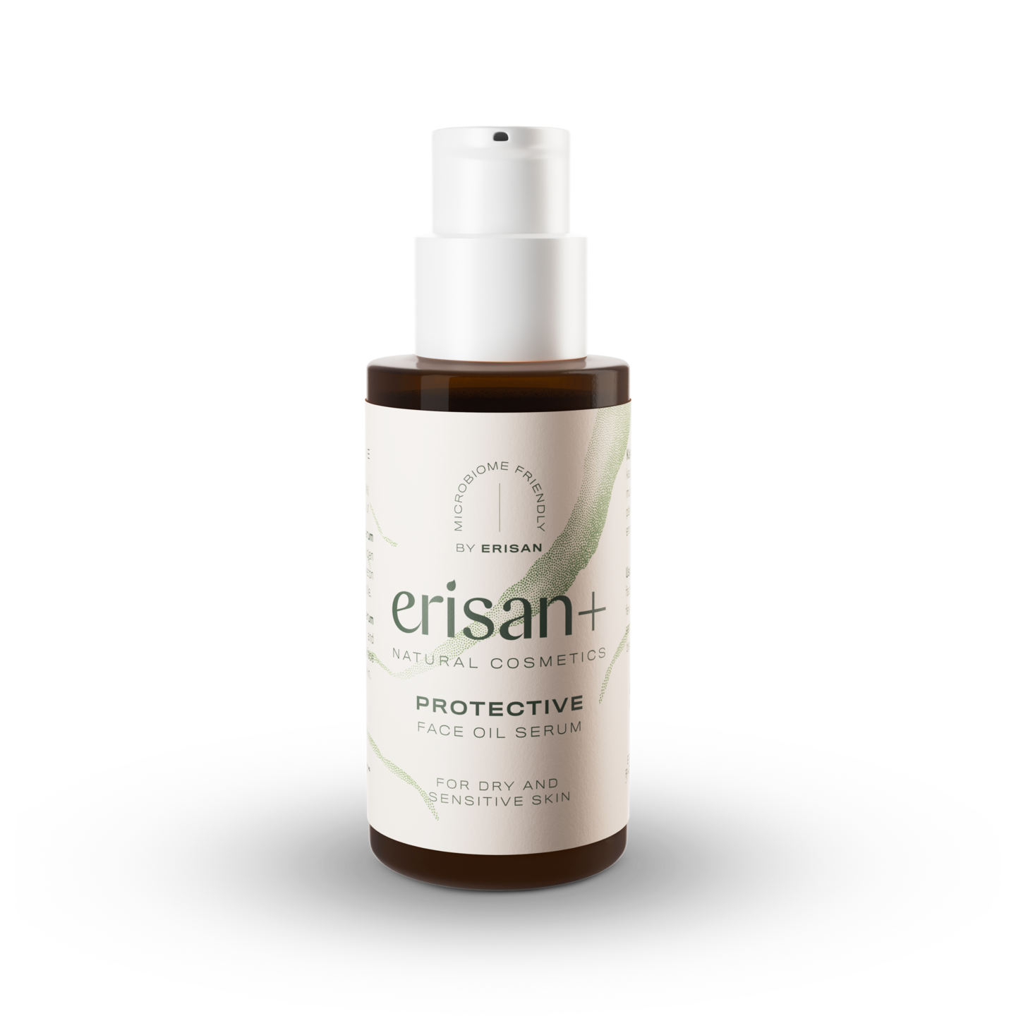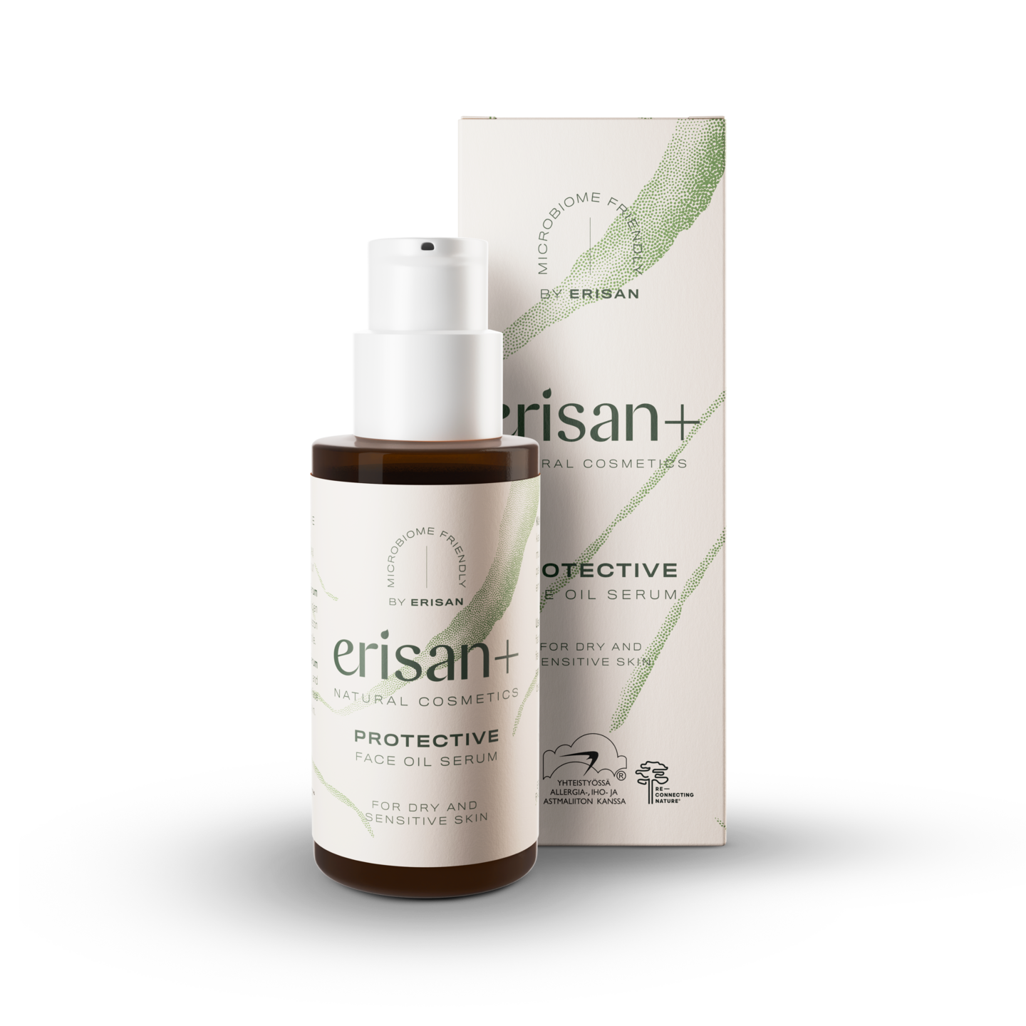 Erisan+ Protective Face Oil Serum on tehokkaasti kosteuttava ja kasvojen iholle kosteutta sitova hajusteeton öljyseerumi kuivalle ja herkälle iholle. Hajusteeton seerumi on Ecocert Cosmos Natural -sertifioitua luonnonkosmetiikkaa, ja sille on myönnetty Allergia-, Iho- ja Astmaliiton Allergiatunnus. Seerumin sisältämät jojobaöljy ja kauraöljy kosteuttavat tehokkaasti ja auttavat tekemään ihosta silkkisen pehmeän. Lisäksi seerumi sisältää Re-Connecting Nature™ -mikrobiuutetta, joka tutkitusti vahvistaa ihon mikrobiomia. Se auttaa vahvistamaan ihon suojakerrosta palauttamalla luonnon mikrobien monimuotoisuuden iholle luontoaltistuksen myötä. Mikrobiuute on väriltään ruskeaa, ja se näkyy tuotteessa pieninä hiukkasina. Erisan+ Protective Face Oil Serum on hajusteeton, vegaaninen ja dermatologisesti testattu herkällä iholla. Erisan+ on herkän ihon tuotesarja, joka on suunniteltu suojaamaan ja vahvistamaan ihon omaa vastustuskykyä ja tukemaan ihon mikrobiomia luonnollisilla raaka-aineilla. Kaikki sarjan tuotteet ovat sertifioitua luonnonkosmetiikkaa ja niille on myönnetty Allergia-, Iho- ja Astmaliiton myöntämä Allergiatunnus. Erisan+ on osa herkälle iholle kehitettyä Erisan-brändiä.