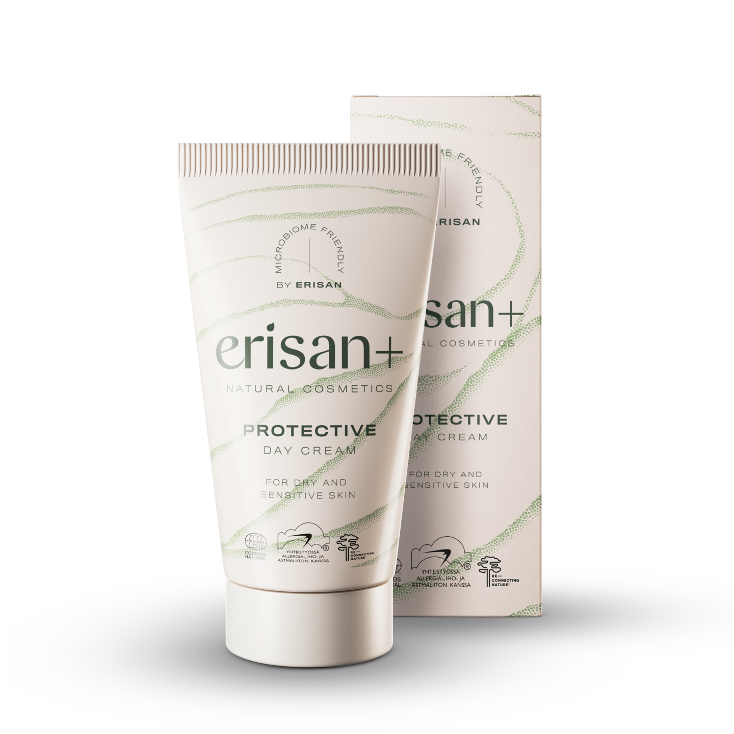 Erisan+ Protective Day Cream on tehokkaasti kosteuttava päivävoide kuivalle ja herkälle iholle. Hajusteteeton voide on Ecocert Cosmos Natural -sertifioitua luonnonkosmetiikkaa, ja sille on myönnetty Allergia-, Iho- ja Astmaliiton Allergiatunnus. Voiteen sisältämät sheavoi ja skvalaani tekevät ihosta silkkisen pehmeän ja tasaisen tuntuisen. Lisäksi voide sisältää Re-Connecting Nature™ -mikrobiuutetta, joka tutkitusti vahvistaa ihon mikrobiomia. Se auttaa vahvistamaan ihon suojakerrosta palauttamalla luonnon mikrobien monimuotoisuuden iholle luontoaltistuksen myötä. Mikrobiuute on väriltään ruskeaa, ja se näkyy tuotteessa pieninä hiukkasina. Erisan+ Protective Day Cream on hajusteeton, vegaaninen ja dermatologisesti testattu herkällä iholla. Erisan+ on herkän ihon tuotesarja, joka on suunniteltu suojaamaan ja vahvistamaan ihon omaa vastustuskykyä ja tukemaan ihon mikrobiomia luonnollisilla raaka-aineilla. Kaikki sarjan tuotteet ovat sertifioitua luonnonkosmetiikkaa ja niille on myönnetty Allergia-, Iho- ja Astmaliiton myöntämä Allergiatunnus. Erisan+ on osa herkälle iholle kehitettyä Erisan-brändiä.