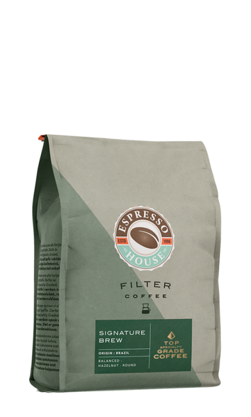 Signature Brew –kahvi on täyteläinen ja pyöreä kahvi, jossa voi maistaa pitkän jälkimaun ja makusävyjä suklaasta ja pähkinöistä.