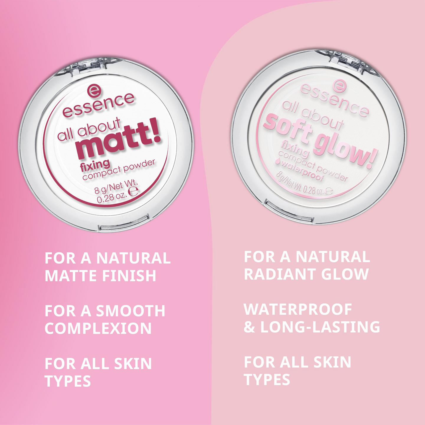 Kuin hellä kohdevalo ihollesi: essence all about soft glow! fixing vedenkestävä, kompakti puuteri antaa täydellisen viimeistelyn mihin tahansa meikkilookiin. Yleissävy saa meikin tuntumaan silkkiseltä ja mukautuu vaivattomasti kaikkiin sävyihin luoden hienovaraisen pehmeän efektin, jossa on ripaus hehkua. Sen kevyt, prässätty koostumus tuntuu erittäin mukavalta ja saa ihosi tuntumaan sileältä ja luonnollisen hehkuvalta. Vedenkestävän koostumuksensa ansiosta raikas hehkusi pysyy paikoillaan – riippumatta siitä, mitä päivä tuo tullessaan.