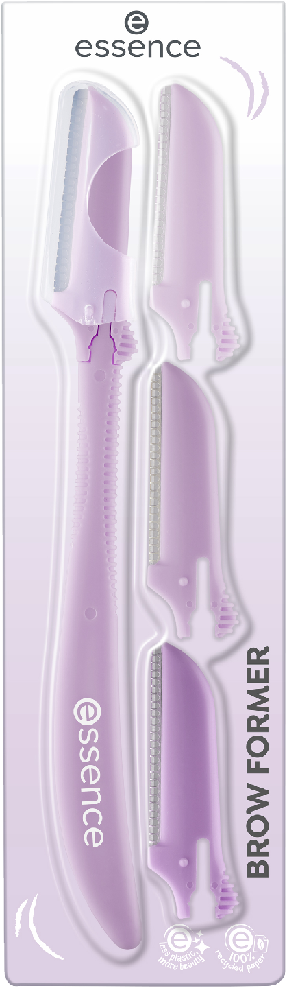 Muotoiltuihin kulmakarvoihin: essence BROW FORMER -muotoilijan terävät terät poistavat karvat ja kuolleen ihon hellävaraisesti. Kolmea vaihtopäätä vaihtamalla jätettä syntyy vähemmän. Lisäksi pakkaus on valmistettu 100-prosenttisesti kierrätetystä paperista.