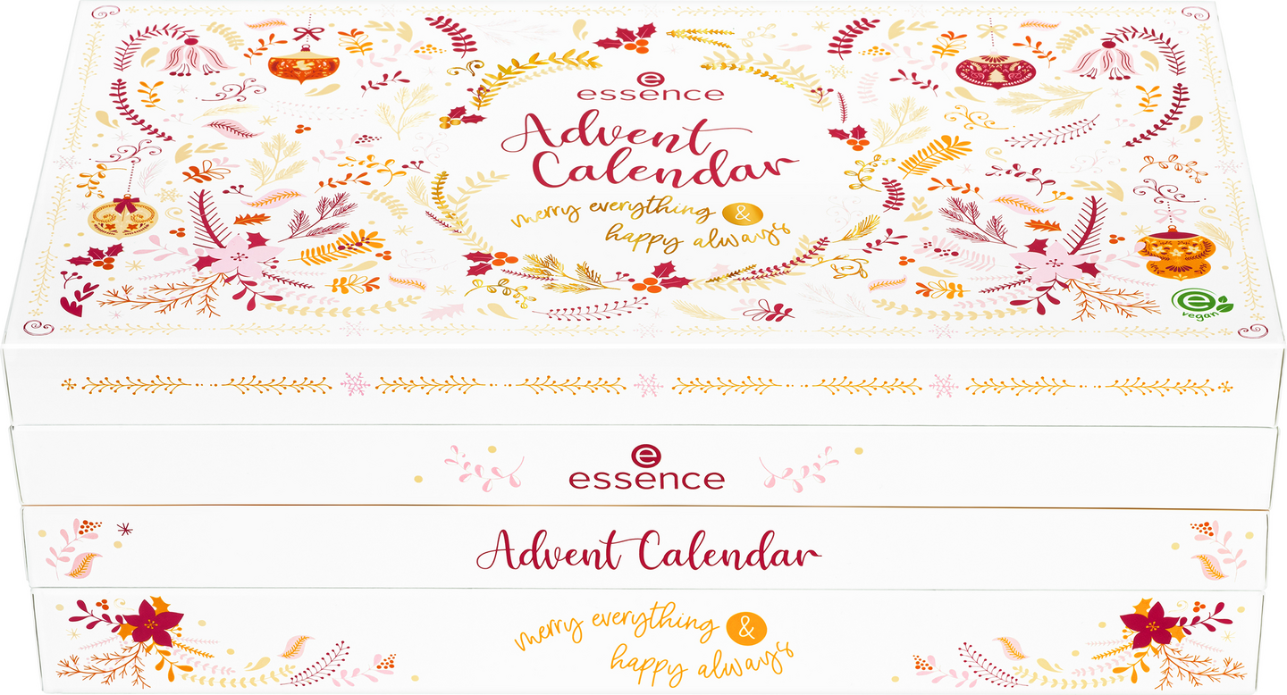 All I want for Christmas... on essencen joulukalenteri merry everything & happy always. Pakkaukseen on kätketty 24 söpöä, jouluisia yksityiskohtia sisältävää rajoitetun erän meikkituotetta sekä joitakin käytännöllisiä meikkitarvikkeita täydelliseen tyylin: kiiltävästä minikynsilakasta, hoitavasta ja hohtavasta huulikiillosta, kasvo- ja kynsihelmistä sekä kulmapinseteistä ravitsevaan holografiseen kasvonaamioon. Tämä joulukalenteri ei jätä mitään toivomisen varaan!
