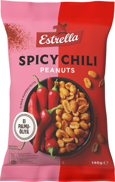 Täyttä makua ilman kuorrutetta! Kunnolla chilin potkua ja pehmeän rapeaksi paahdettuja maapähkinöitä. Näihin tulisiin maapähkinöihin jää koukkuun.