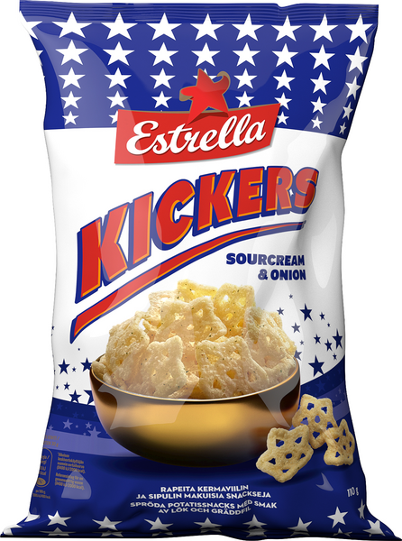 Klassikon odotettu paluu! Kickers hurmasi sipsinystävät jo 90-luvulla rapeudellaan ja herkullisella sourcream & onion -mausteellaan. Jos et tätä herkkua päässyt silloin vielä maistamaan, niin nyt kannattaa viimeistään napata tämä kestosuosikki omaan ostoskoriin!