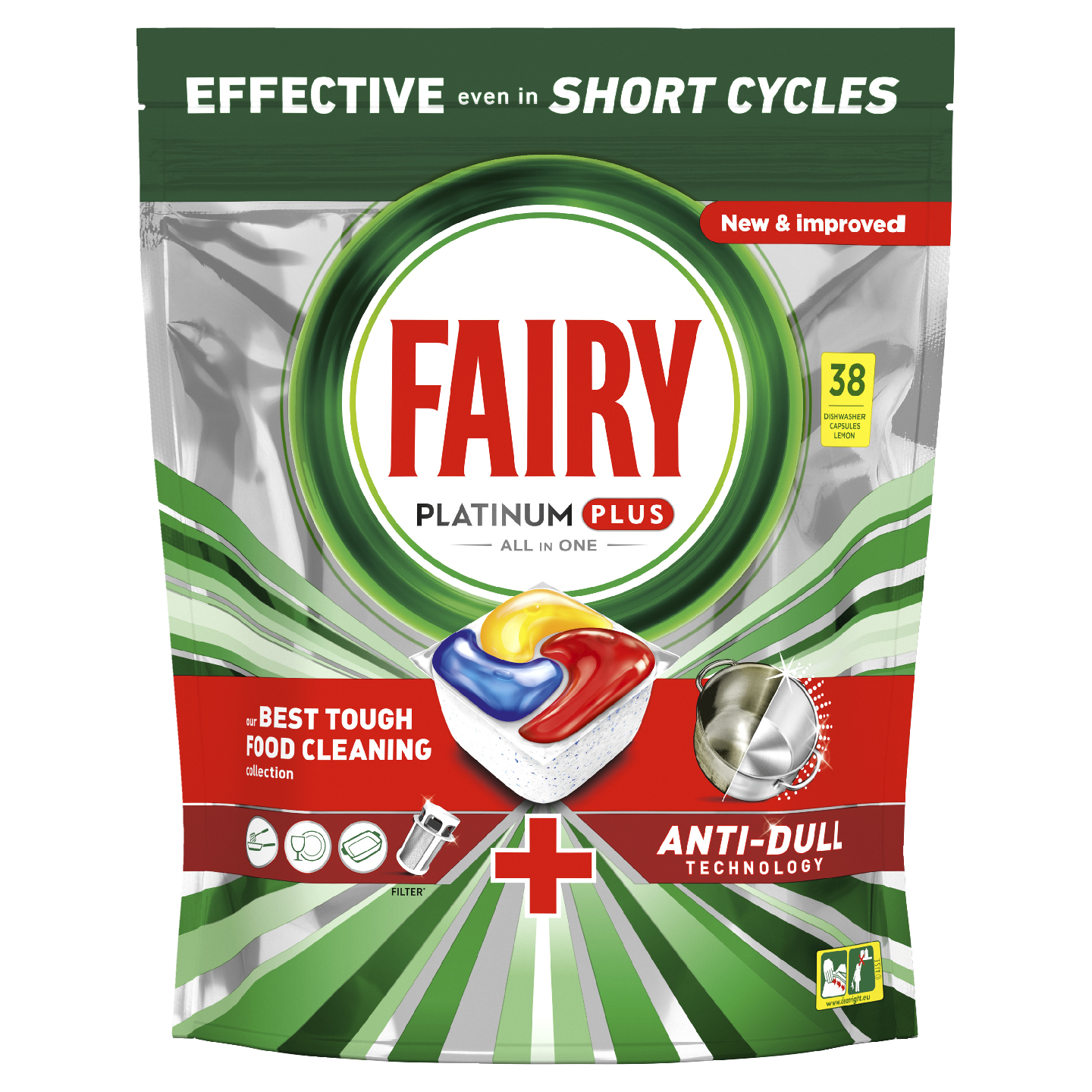 Fairy Platinum Plus All in One -konetiskitabletit poistavat astioista ajan myötä muodostuneen sameuden auttaen palauttamaan niiden alkuperäisen kiillon. Ja siirtymällä lyhyeen pesuohjelmaan säästät aikaa, energiaa ja vettä verrattuna tavalliseen ohjelmaan! Fairy Platinum Plus -tableteissa on esipesujärjestelmä. Kun käytät Fairy Platinum Plus -tabletteja et siis tarvitse erillistä esipesua, mikä auttaa säästämään vettä ja luontoa. Fairyn tehokkaissa astianpesutableteissa on sekä neste- että jauhepesuainetta. Äärimmäisen helposti liukeneva tabletti alkaa vaikuttamaan nopeasti, minkä ansiosta tabletteja voi käyttää myös lyhyellä ohjelmalla. Tabletit ovat lisäksi todella helppokäyttöisiä. Ei avattavaa käärettä – aseta vain tabletti astianpesukoneen annostelulokeroon. Konetiskitableteissa sisältävät suola- ja huuhtelukirkastetoiminnon sekä lasi- ja hopeasuojan.