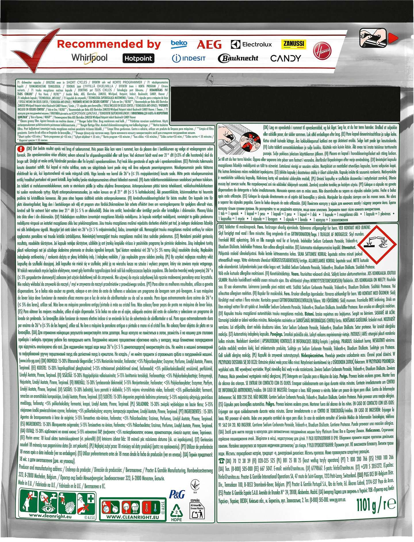 Fairy Platinum Plus All in One -astianpesutableteilla saat uuden kaltaisen puhtauden. Ne tarjoavat Fairyn parhaan valikoiman pinttyneen lian puhdistamiseen, ja poistavat myös ajan myötä muodostuneen sameuden auttaen palauttamaan astioiden alkuperäisen kiillon. Fairy Platinum Plus tarjoaa erinomaista puhdistustehoa ja poistaa pinttyneet ruokatahrat myös lyhyen pesuohjelman aikana. Jos aikaa on vähän, ei hätää. Valitse lyhyt ohjelma. Fairyn tehokkaissa astianpesutableteissa on sekä neste- että jauhepesuainetta. Äärimmäisen helposti liukeneva tabletti alkaa vaikuttamaan nopeasti, minkä ansiosta tabletteja voi käyttää myös lyhyellä ohjelmalla. Tabletit ovat lisäksi todella helppokäyttöisiä. Ei avattavaa käärettä – aseta vain tabletti astianpesukoneen annostelulokeroon.