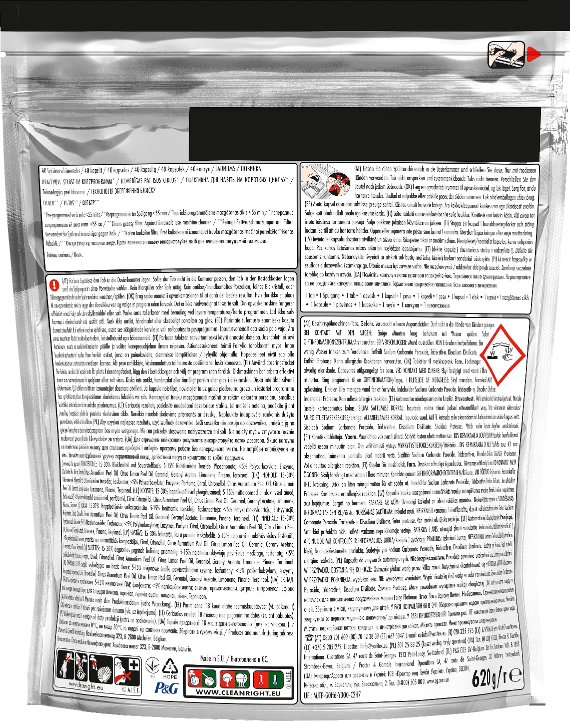 YLIVOIMAISEN PUHDASTA, MYÖS LYHYILLÄ PESUOHJELMILLA. Tutustu Fairy Platinum Plus All-in-One -astianpesutabletteihin – ratkaisu takaa erinomaisen puhtaat astiat myös ilman esipesua. Suunniteltu selviämään vaikeista puhdistushaasteista, aivan kuten nestemäinen Fairy-astianpesuaine, mutta kätevässä tablettimuodossa. Anti-Dull-teknologian ansiosta Fairy Platinum Plus poistaa sameuden ja palauttaa astioiden alkuperäisen kiillon. Fairy Platinum Plus -astianpesuaineen ultraliukoinen pussi liukenee nopeasti ja alkaa puhdistaa nopeasti ja tehokkaasti. Tableteissa yhdistyvät neste ja jauhe, joilla on poikkeuksellinen puhdistusteho ja joiden käyttö on kätevää. Ne tehoavat pinttyneeseen rasvaan myös lyhyillä pesuohjelmilla (lt/ 55 min esiohjelmoitu pesuohjelma). Koe upea kiilto, Anti-Dull-vaikutus ja puhdas suodatin, joka saa astianpesukoneen tuntumaan raikkaalta. Astianpesutablettien käyttö on uskomattoman helppoa – niissä on sisäänrakennettu astianpesukonesuola ja huuhtelukirkaste. Käsittele vain kuivin käsin. Sulje pussi uudelleen jokaisen käyttökerran jälkeen.