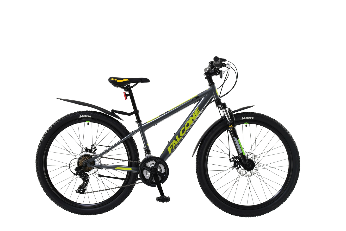 Falcone XC26 maastopyörä, Shimano 21-v vaihteisto, TX-300 revoshift-vaihtajilla, Logan-levyjarrut, joustohaarukka, 26'' Mitas Scyla renkaat, seisontatuki, lokasuojat, soittokello, heijastimet