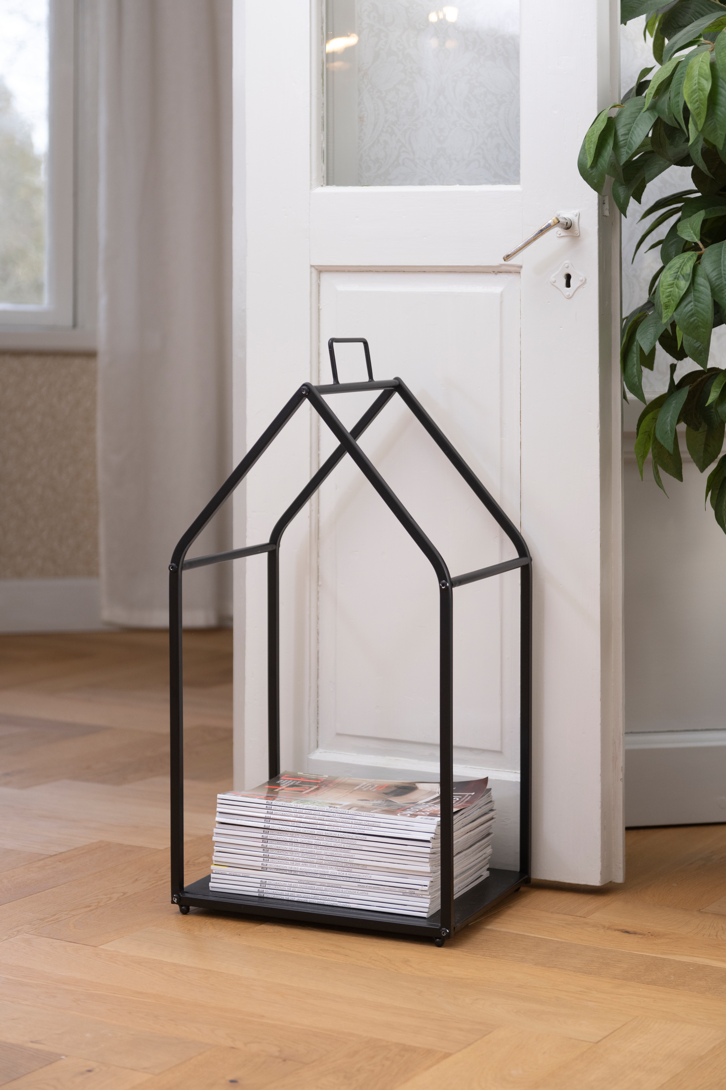 Metallinen talonmuotoinen telinen polttopuille. Väri musta. Enimmäiskuormitus 10 kg. Koko 30 x 35,5 x 75,5 cm. Koottava. Materiaali: rauta.