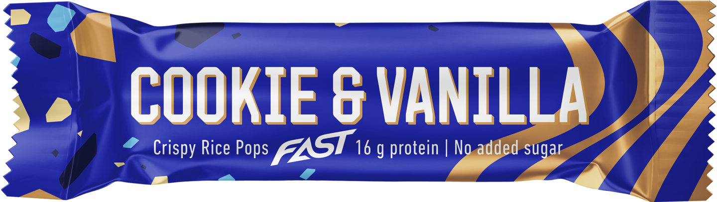 FAST Cookie & Vanilla proteiinipatukassa ainutlaatuisen pehmeä täyte yhdistyy täyteläiseen, krispiseen maitosuklaakuorrutteeseen. Rapeat riisimurot antavat herkullisen twistin vanilja-suklaakeksinmakuiselle patukalle. FAST Cookie & Vanilla tarjoaa runsaasti proteiinia ilman grammaakaan lisättyä sokeria ja palmuöljyä. Sen sisältämät proteiinit edistävät lihasmassan kasvua ja ylläpitämistä.