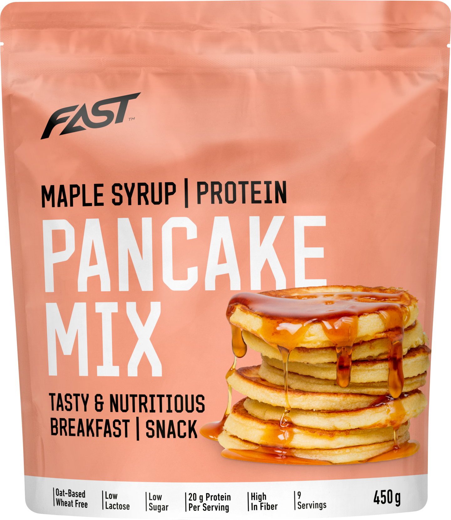 FAST PROTEIN PANCAKE MIX Maple syrup on vaahterasiirapin makuinen, runsaasti proteiinia sisältävä vähälaktoosinen ja –sokerinen pannukakkujauhe, josta valmistat helposti herkullisia proteiinipannukakkuja aamu- ja välipalaksi. Raaka-aineet koostuvat ravinteikkaista ainesosista, kuten kaurasta, psylliumkuidusta ja kananmunajauheesta. Tuotteen sisältämä proteiini edistää lihasmassan kasvua ja ylläpitämistä. Lisäksi PROTEIN PANCAKE MIX sisältää runsaasti kuitua ja kalsiumia.