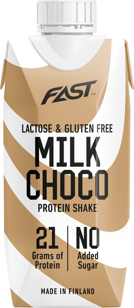 Laktoositon ja gluteeniton FAST Protein Shake Milk Choco on täyteläinen suklaanmakuinen proteiinijuoma. Se sisältää 21 g ravitsevaa proteiinia eikä lainkaan lisättyä sokeria. Nauti shake herkullisena välipalana tai tue palautumistasi treenin jälkeen. Valmistettu Suomessa.