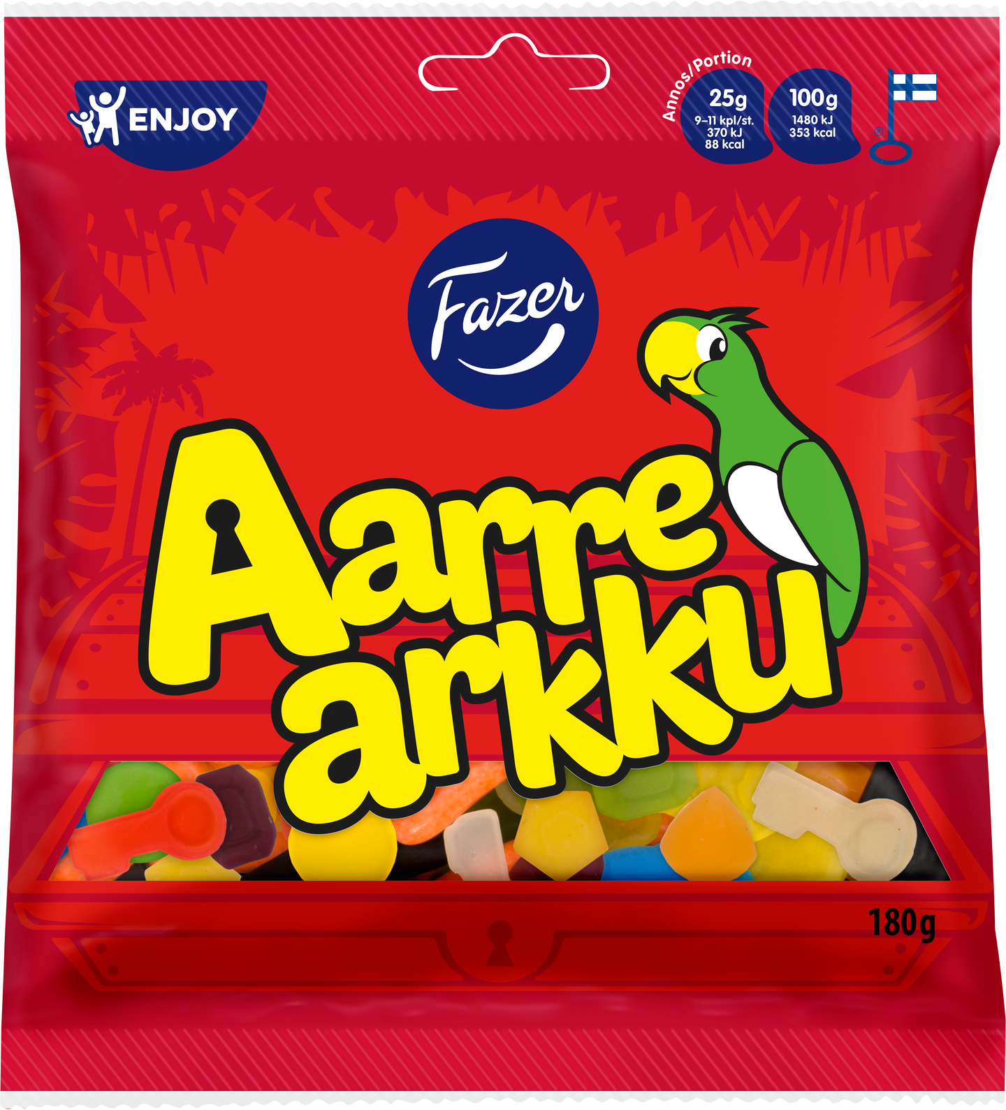 Koko perheen suosikkipussi Aarrearkku on satumainen yhdistelmä hedelmän, salmiakin ja lakun makuisia hauskoja karkkimuotoja. Lähde m akuseikkailuun Aarrearkun syvyyksiin ja sieppaa suuhusi aarrearkun avaimet, rosvolantit ja jalokivet! Avaa Aarrearkku yksin tai kave rien kanssa.