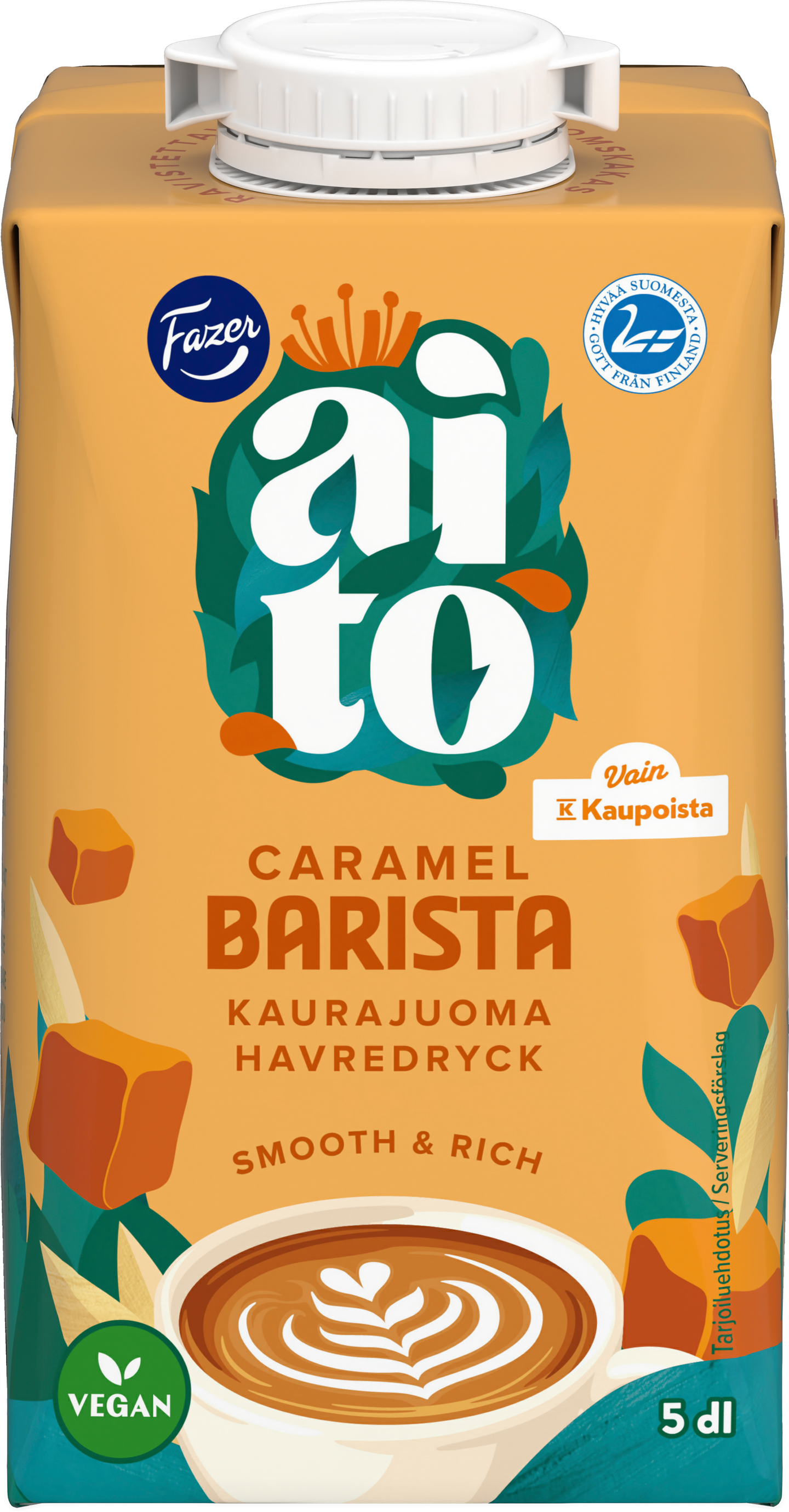 Kotimainen Fazer Aito Caramel Barista on täyteläinen, kinuskikaramellin makuinen kaurajuoma. Huipputoiminnallisuus vaahdotettaessa, josta syntyy erityisen täyteläinen koostumus. Tuote sopii täydellisesti kahviin kaadettaessa sellaisenaan tai erikoiskahveihin, kuten cappuccinoon, latteen sekä jääkahveihin. Tuote on vegaaninen sekä maidoton ja sillä on Hyvää Suomesta -merkki.