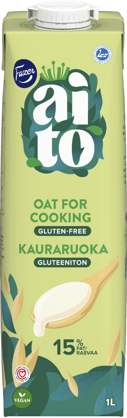 Fazer Aito Oat for Cooking Kauraruoka tekee ruoanlaitosta helppoa ja mukavaa. Kauraruoka lisää kätevästi täyteläisyyttä keittoihin ja kastikkeisiin. Fazer Aito Oat for Cooking Kauraruoka on kasvipohjainen, ruokakerman tapaan käytettävä tuote, joka sisältää kotimaista kauraa. Tuote on gluteeniton, vegaaninen ja maidoton.