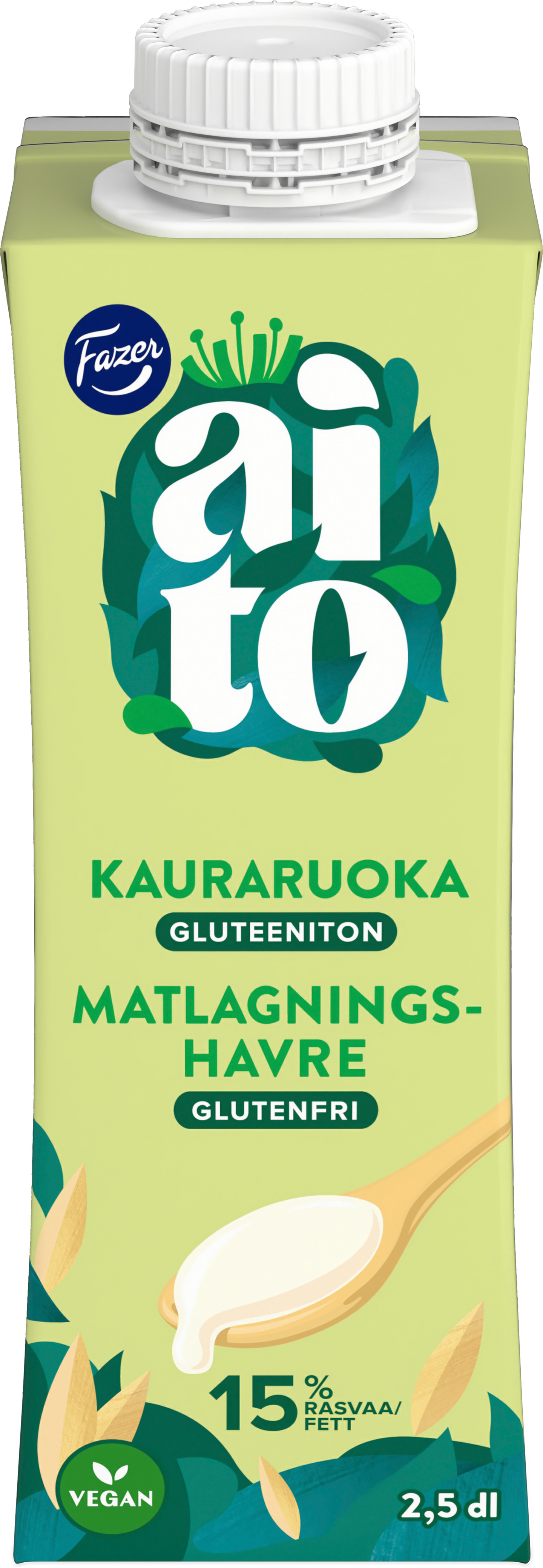Fazer Aito Kauraruoka 15% tekee ruoanlaitosta helppoa ja mukavaa. Kauraruoka lisää kätevästi täyteläisyyttä keittoihin ja kastikkeisiin. Fazer Aito Kauraruoka on kasvipohjainen, ruokakerman tapaan käytettävä tuote, joka sisältää kotimaista kauraa. Tuote on gluteeniton, vegaaninen ja maidoton. Tuotteella on Hyvää Suomesta -merkki. Fazer Aito Kauraruoka -tuotteet löydät kylmähyllystä.