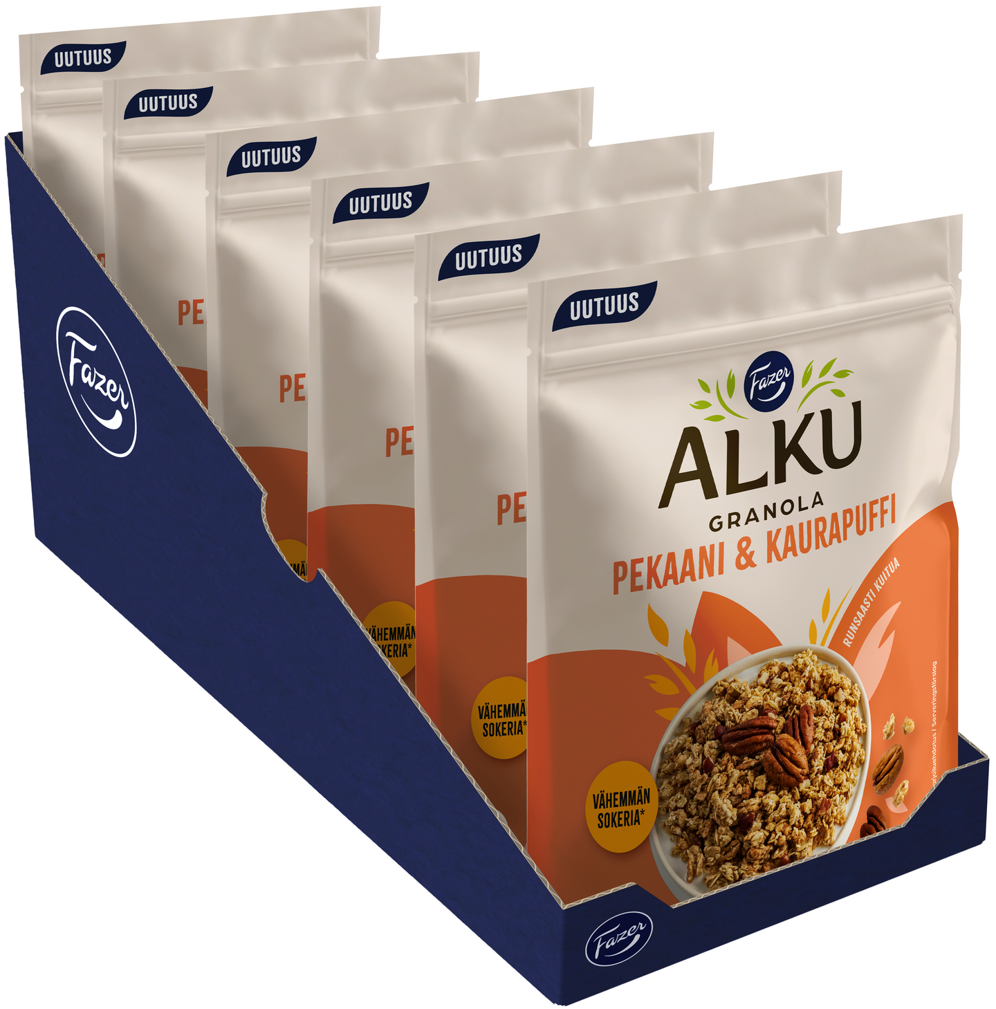 Fazer Alku Pekaani & kaurapuffi granola on herkullinen sekoitus paahdettua kauragranolaa, rapeita kaurapuffeja ja maukkaita pekaanipähkinöitä. Täysjyväkaurasta valmistetussa granolassa on vähemmän sokeria ja runsaasti kuitua – ja sille on myönnetty Sydänmerkki. Kokeile myös kreikkalaisen jogurtin tai kasvipohjaisen gurtin kanssa maukkaaksi aamu- tai välipalaksi. Alku hyviin hetkiin!