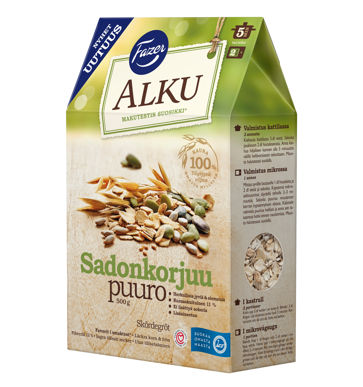 Runsaskuituisessa Sadonkorjuupuurossa yhdistyvät maukkaat täysjyvähiutaleet sekä rouheat kurpitsan-, auringonkukan- ja pellavansiemenet. Tuotteesta valmistuu herkullinen puuro vain 5 minuuttia keittämällä tai 2 minuutissa mikrossa. Valmistettu suomalaisesta viljasta Fazerin myllyssä Lahdessa. Alku hyviin hetkiin!